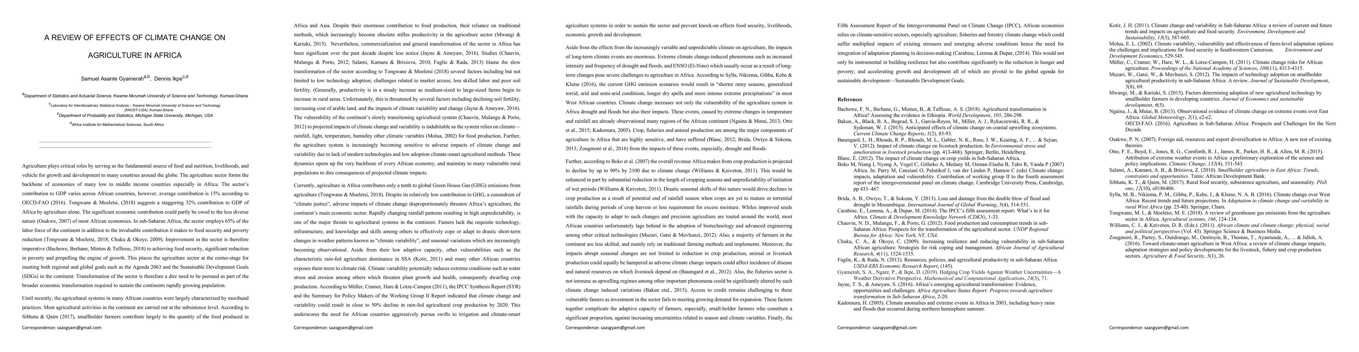 Currently, agriculture in Africa contributes only a tenth to global Green House Gas (GHG) emissions from agriculture. Despite its relatively low contribution to GHG, a conundrum of "climate justice", adverse impacts of climate change disproportionately threaten Africa's agriculture, the Continent's main economic sector. Consequently, we seek to review the effects of climate change on Agriculture.