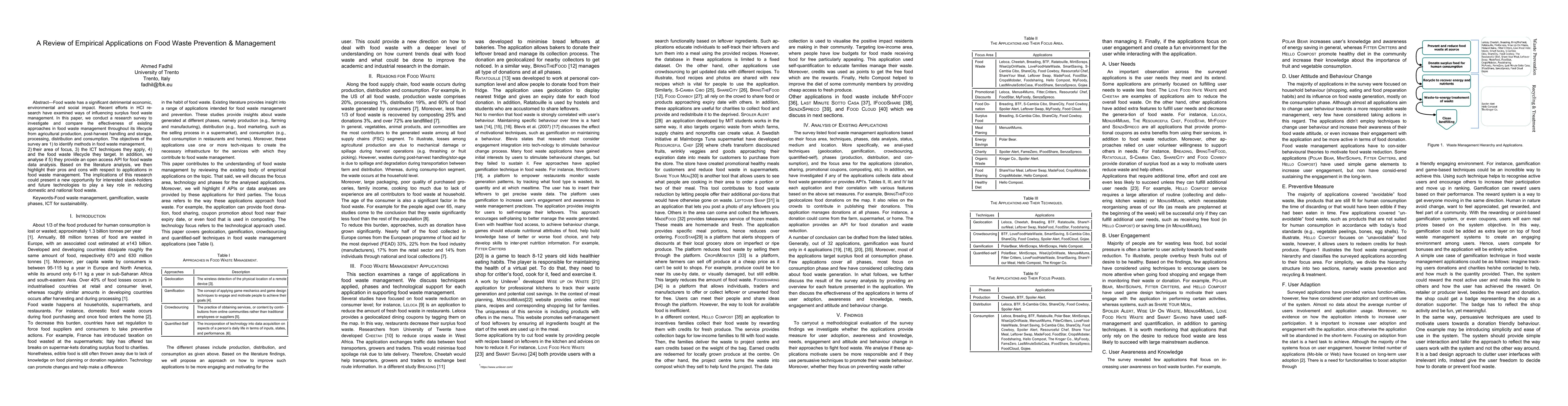 This paper reviews empirical studies on food waste prevention and management, analyzing methods, ICT techniques, and lifecycle stages they target. It identifies strengths and weaknesses, aiming to inform stakeholders and future technologies in reducing food waste.