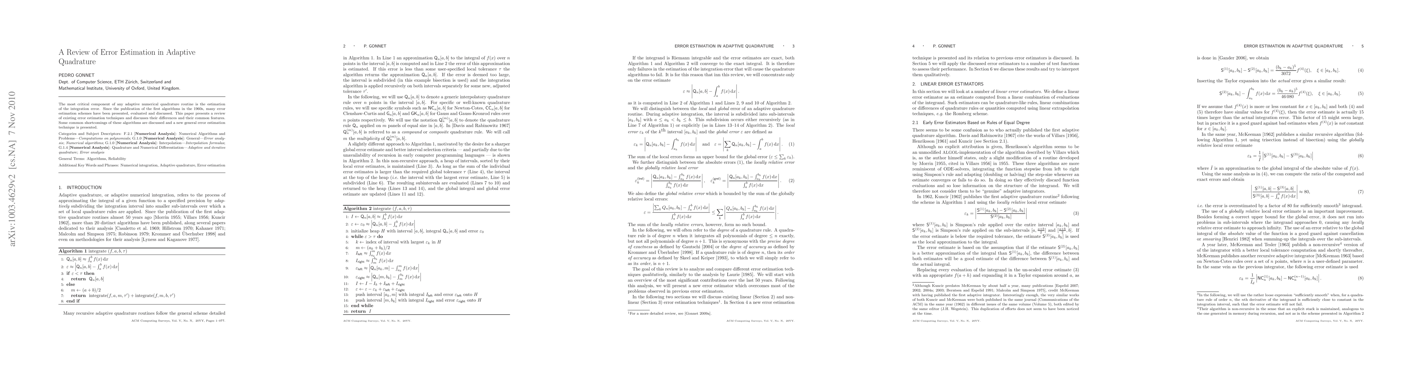 The most critical component of any adaptive numerical quadrature routine is the estimation of the integration error. Since the publication of the first algorithms in the 1960s, many error estimation schemes have been presented, evaluated and discussed. This paper presents a review of existing error estimation techniques and discusses their differences and their common features. Some common shortcomings of these algorithms are discussed and a new general error estimation technique is presented.