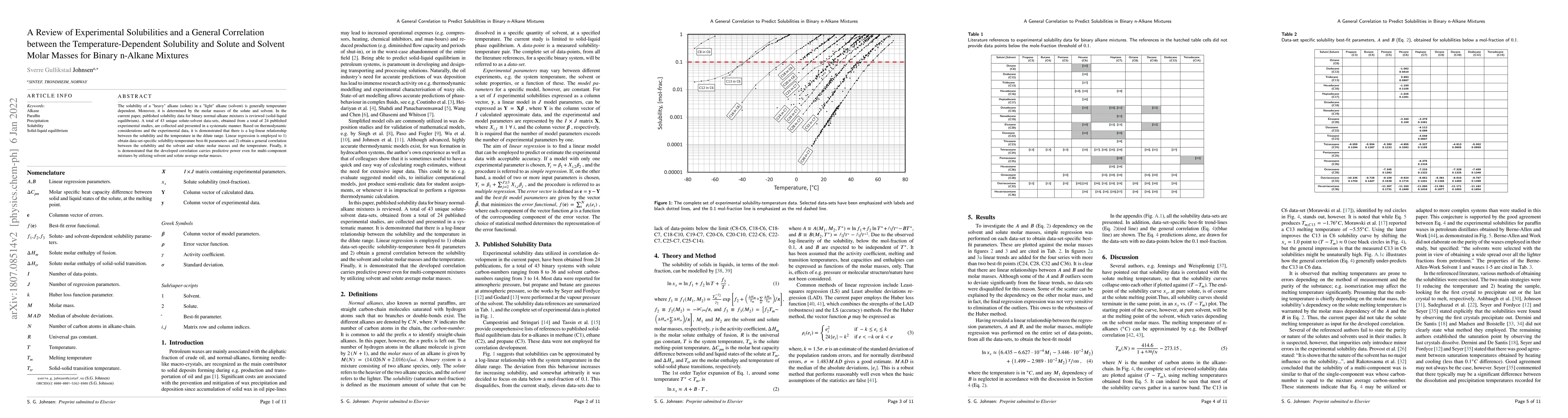 This paper reviews experimental solubility data for binary n-alkane mixtures, establishing a log-linear relationship between solubility and temperature. It also develops a general correlation linking solubility to solute and solvent molar masses, validated through linear regression and predictive for multi-component mixtures.