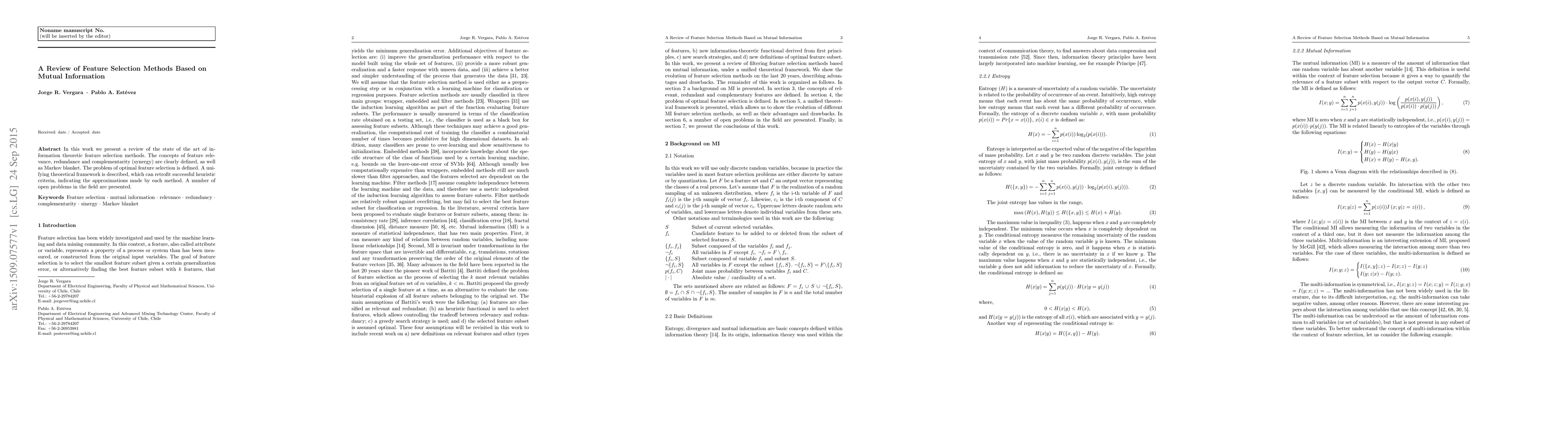 This paper reviews advanced information-theoretic feature selection methods, defining key concepts like relevance, redundancy, and complementarity, and presents a unifying theoretical framework to analyze and compare existing heuristic criteria. It also highlights several open problems in the field.