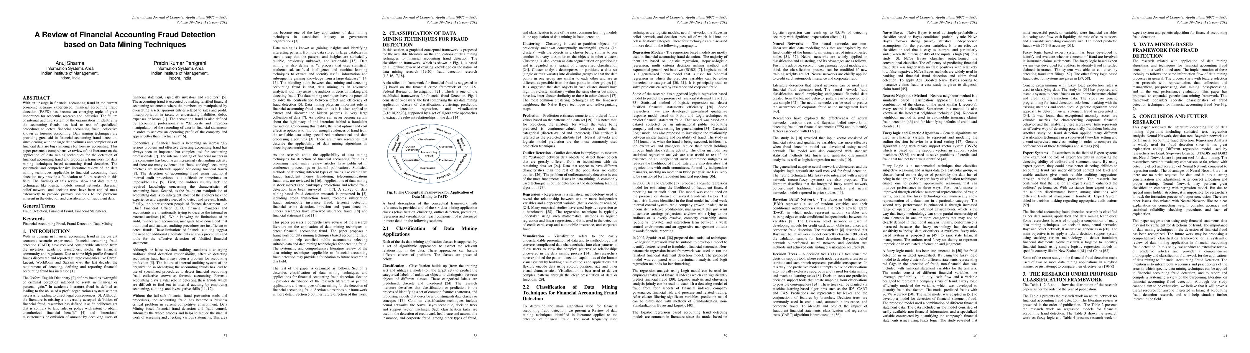 This paper reviews the application of data mining techniques for detecting financial accounting fraud, highlighting logistic models, neural networks, Bayesian belief networks, and decision trees as the most effective methods. It proposes a framework to guide future research and improve fraud detection using these advanced techniques.
