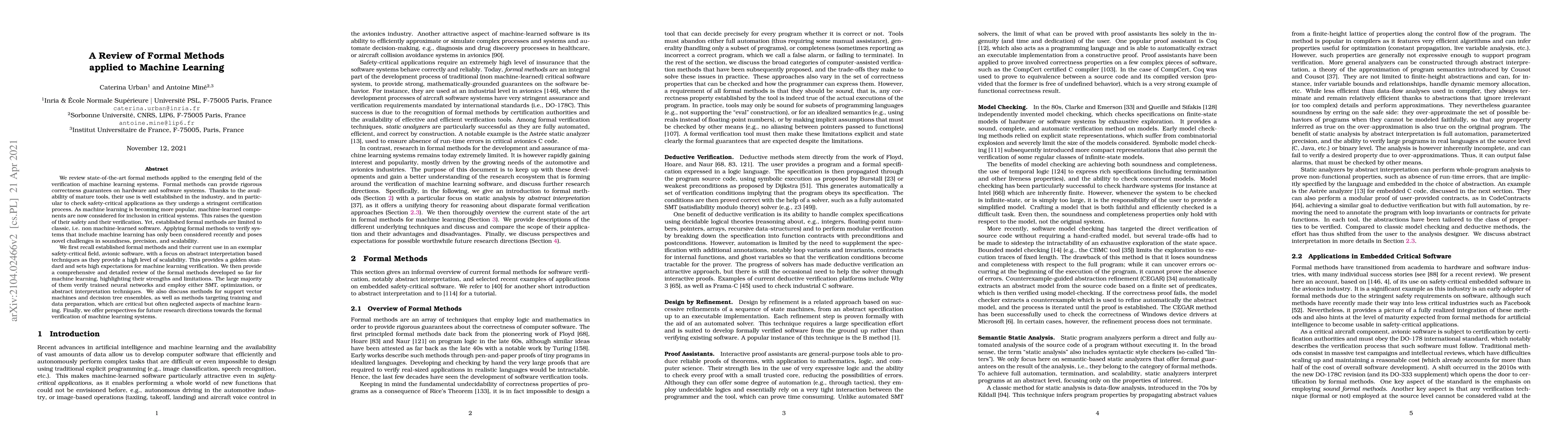 A review of formal methods for verifying machine learning systems reveals both existing approaches and challenges in applying traditional methods to this emerging field. The study highlights the need for future research directions in formal verification of machine learning systems.