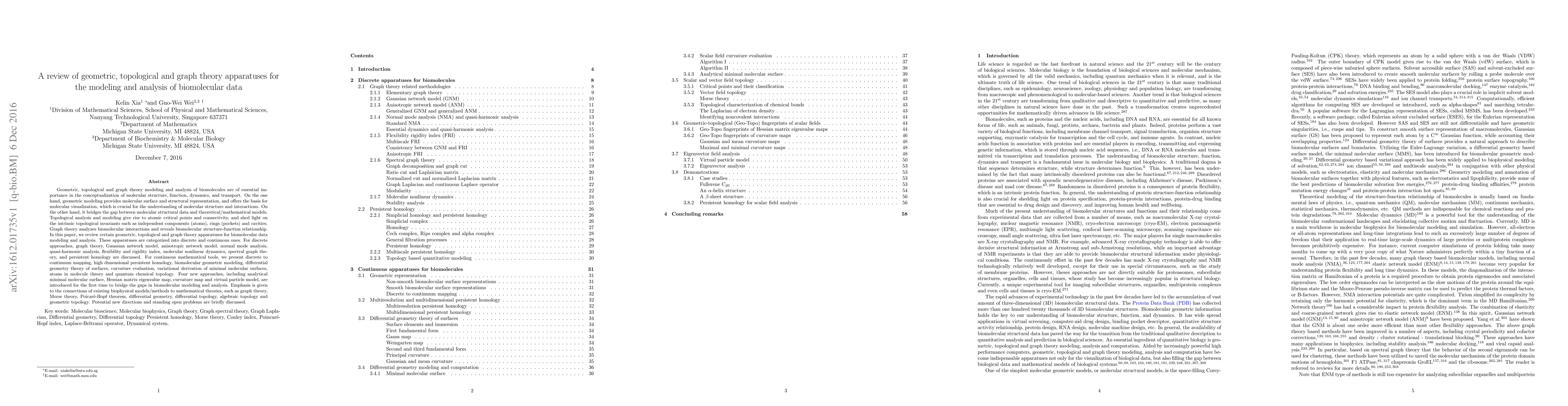 This paper reviews geometric, topological, and graph theory methods for modeling and analyzing biomolecular data, categorizing them into discrete and continuous approaches. It introduces novel methods like the analytical minimal molecular surface and discusses established techniques such as persistent homology and spectral graph theory to bridge gaps in biomolecular modeling.