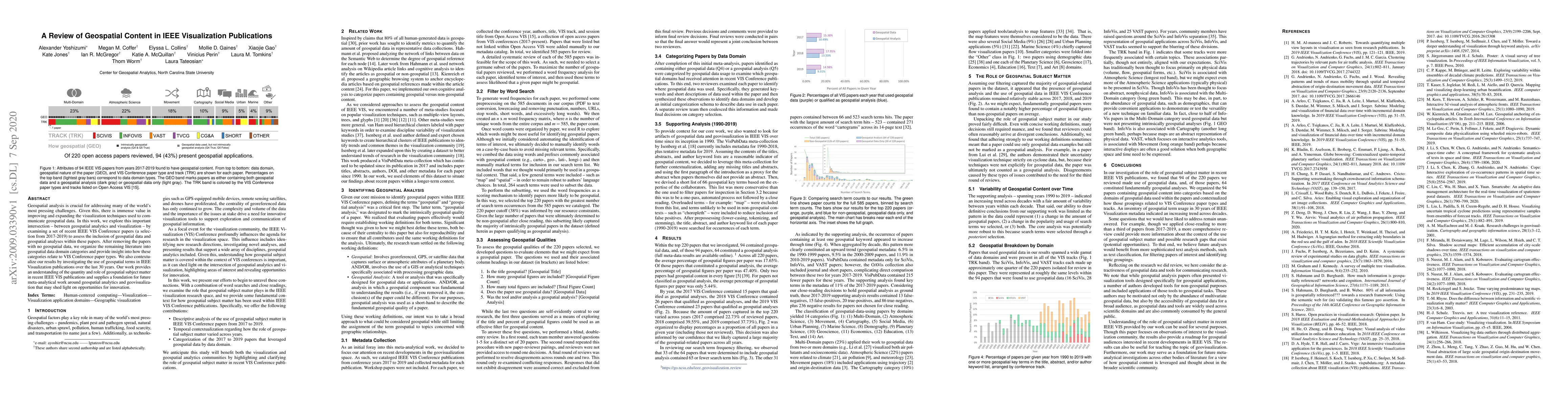 This paper reviews geospatial content in IEEE Visualization publications to understand the quantity and role of geospatial data and analysis in recent papers. It provides a foundation for future meta-analytical work on geospatial analytics and visualization.