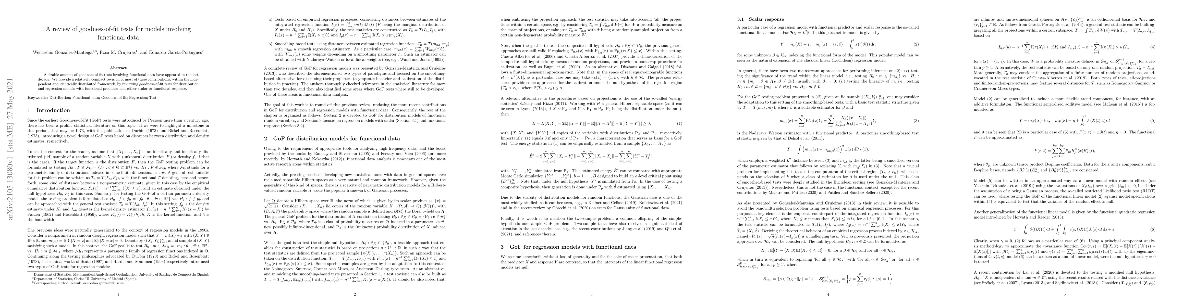 This paper reviews recent advancements in goodness-of-fit tests for models involving functional data, focusing on both distribution and regression models with functional predictors and scalar or functional responses within an independent and identically distributed framework.