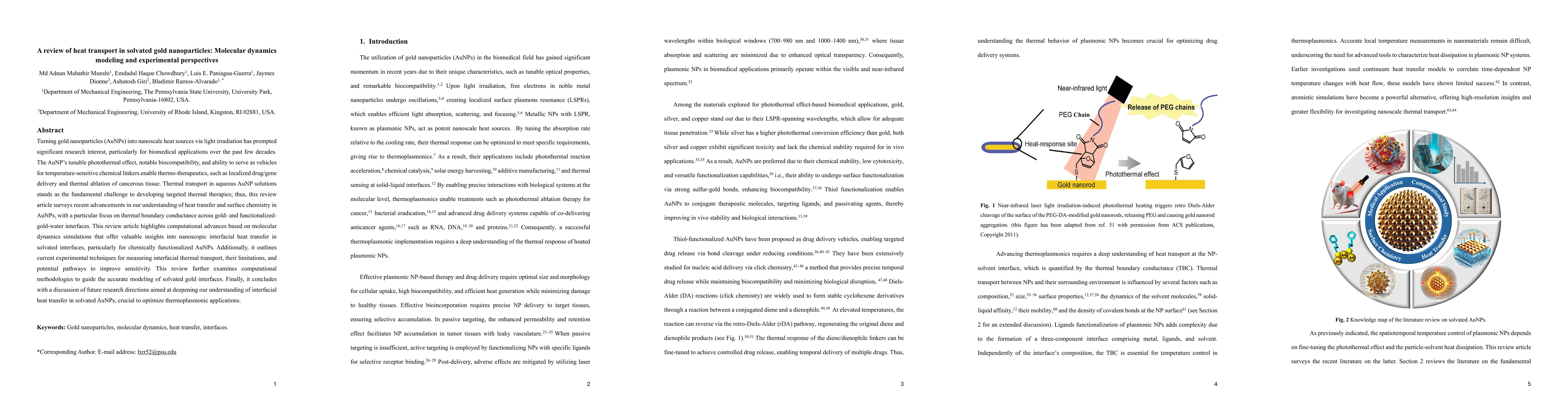 Turning gold nanoparticles (AuNPs) into nanoscale heat sources via light irradiation has prompted significant research interest, particularly for biomedical applications over the past few decades. The AuNP's tunable photothermal effect, notable biocompatibility, and ability to serve as vehicles for temperature-sensitive chemical linkers enable thermo-therapeutics, such as localized drug/gene delivery and thermal ablation of cancerous tissue. Thermal transport in aqueous AuNP solutions stands as the fundamental challenge to developing targeted thermal therapies; thus, this review article surveys recent advancements in our understanding of heat transfer and surface chemistry in AuNPs, with a particular focus on thermal boundary conductance across gold- and functionalized-gold-water interfaces. This review article highlights computational advances based on molecular dynamics simulations that offer valuable insights into nanoscopic interfacial heat transfer in solvated interfaces, particularly for chemically functionalized AuNPs. Additionally, it outlines current experimental techniques for measuring interfacial thermal transport, their limitations, and potential pathways to improve sensitivity. This review further examines computational methodologies to guide the accurate modeling of solvated gold interfaces. Finally, it concludes with a discussion of future research directions aimed at deepening our understanding of interfacial heat transfer in solvated AuNPs, crucial to optimize thermoplasmonic applications.
