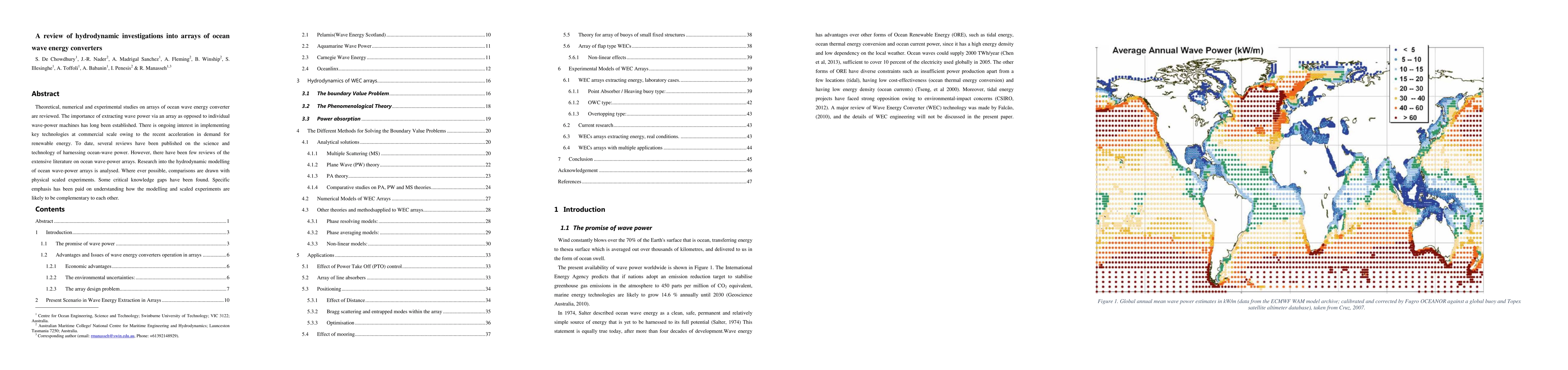 This paper reviews theoretical, numerical, and experimental studies on arrays of ocean wave energy converters, highlighting the importance of array-based wave power extraction and identifying critical knowledge gaps. It emphasizes the complementary nature of modelling and scaled experiments in advancing ocean wave-power technology.