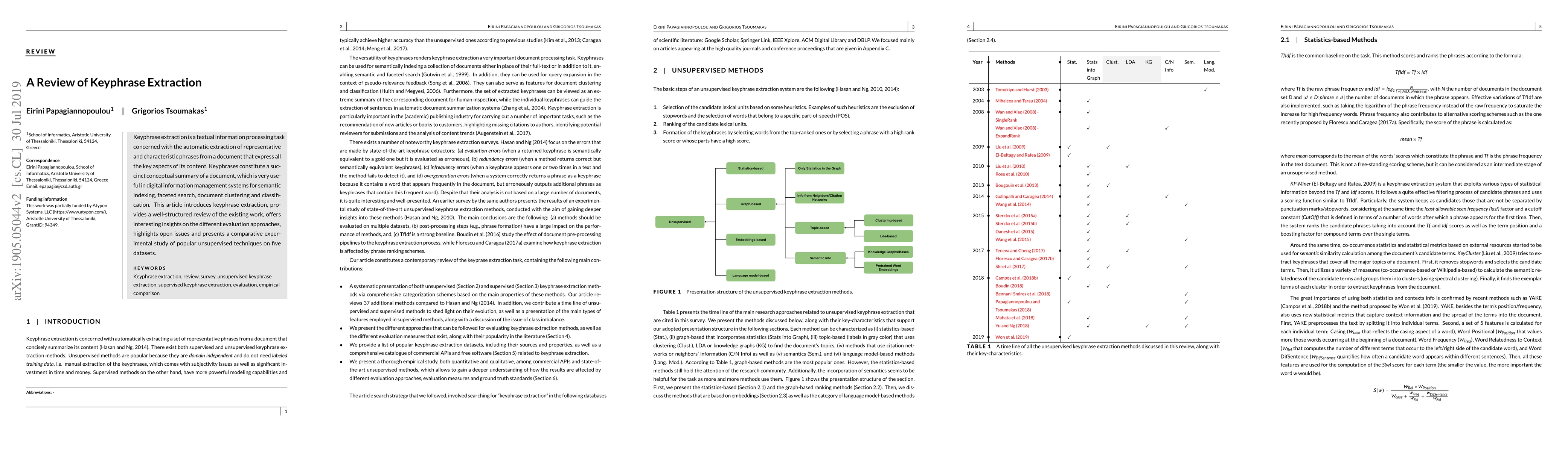 This paper reviews keyphrase extraction methods, summarizing existing techniques and their applications in semantic indexing and document management. It also evaluates various unsupervised approaches through a comparative study on multiple datasets.