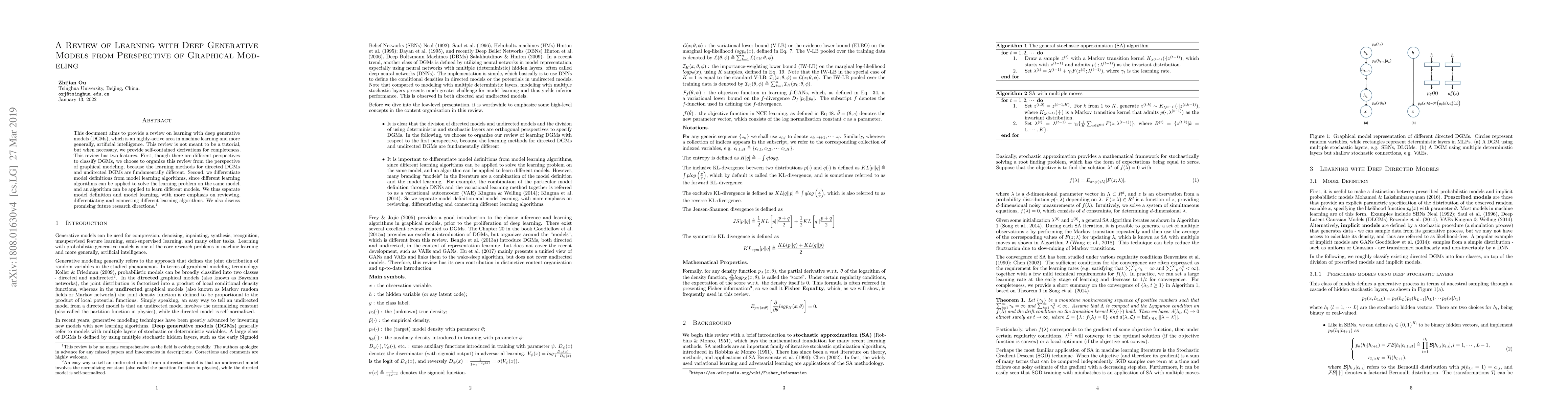 This document aims to provide a review on learning with deep generative models (DGMs), which is an highly-active area in machine learning and more generally, artificial intelligence. This review is not meant to be a tutorial, but when necessary, we provide self-contained derivations for completeness. This review has two features. First, though there are different perspectives to classify DGMs, we choose to organize this review from the perspective of graphical modeling, because the learning methods for directed DGMs and undirected DGMs are fundamentally different. Second, we differentiate model definitions from model learning algorithms, since different learning algorithms can be applied to solve the learning problem on the same model, and an algorithm can be applied to learn different models. We thus separate model definition and model learning, with more emphasis on reviewing, differentiating and connecting different learning algorithms. We also discuss promising future research directions.