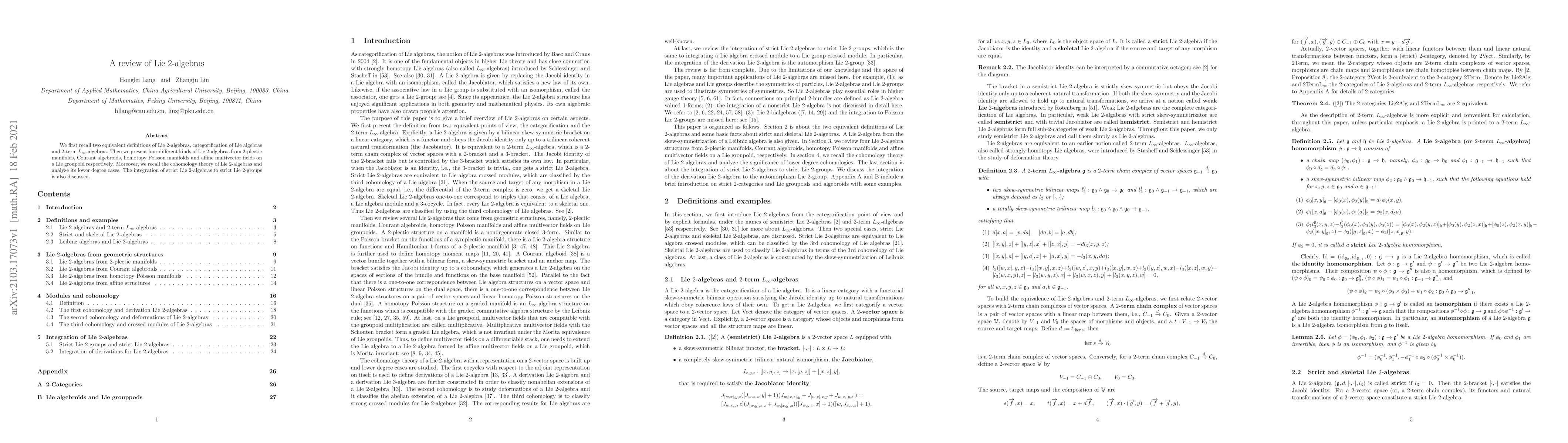 Summary: This paper reviews two equivalent definitions of Lie 2-algebras and explores four distinct types derived from various mathematical structures. It also discusses the cohomology theory of Lie 2-algebras and the integration process to Lie 2-groups.