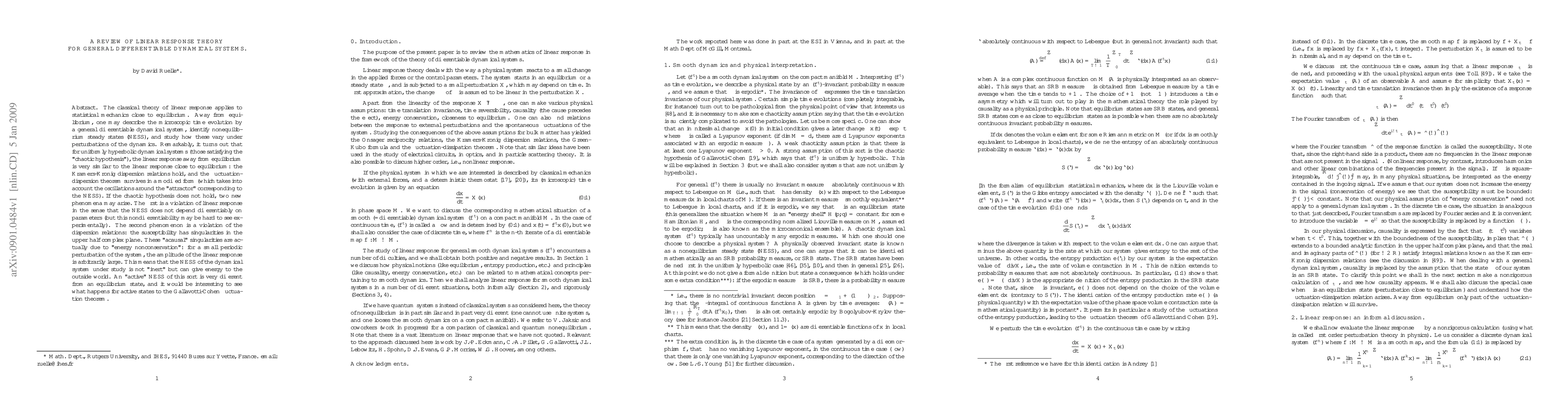 The classical theory of linear response applies to statistical mechanics close to equilibrium. Away from equilibrium, one may describe the microscopic time evolution by a general differentiable dynamical system, identify nonequilibrium steady states (NESS), and study how these vary under perturbations of the dynamics. Remarkably, it turns out that for uniformly hyperbolic dynamical systems (those satisfying the "chaotic hypothesis"), the linear response away from equilibrium is very similar to the linear response close to equilibrium: the Kramers-Kronig dispersion relations hold, and the fluctuation-dispersion theorem survives in a modified form (which takes into account the oscillations around the "attractor" corresponding to the NESS). If the chaotic hypothesis does not hold, two new phenomena may arise. The first is a violation of linear response in the sense that the NESS does not depend differentiably on parameters (but this nondifferentiability may be hard to see experimentally). The second phenomenon is a violation of the dispersion relations: the susceptibility has singularities in the upper half complex plane. These "acausal" singularities are actually due to "energy nonconservation": for a small periodic perturbation of the system, the amplitude of the linear response is arbitrarily large. This means that the NESS of the dynamical system under study is not "inert" but can give energy to the outside world. An "active" NESS of this sort is very different from an equilibrium state, and it would be interesting to see what happens for active states to the Gallavotti-Cohen fluctuation theorem.
