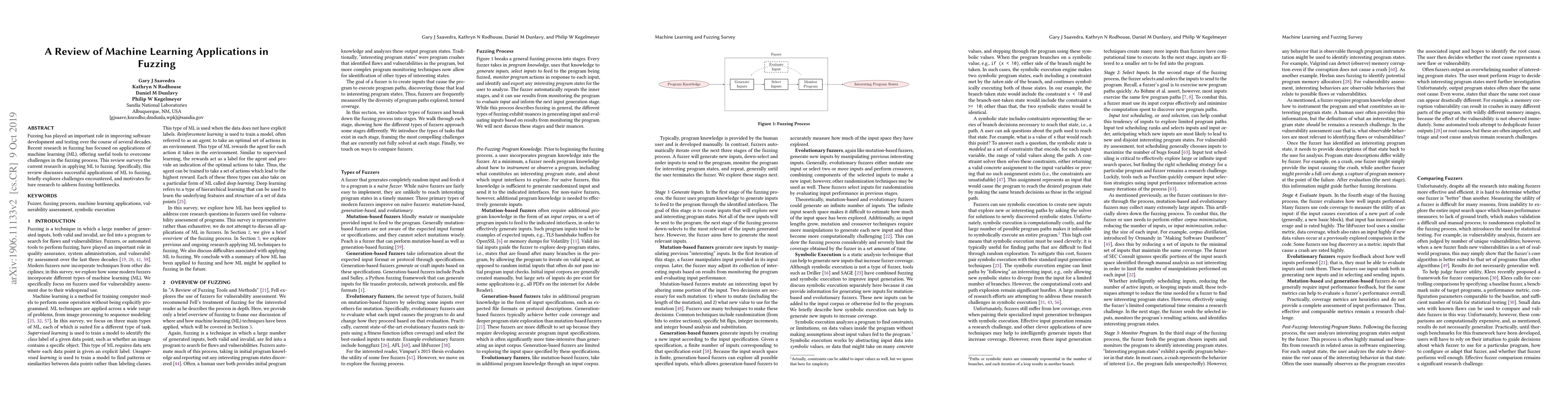 Fuzzing has played an important role in improving software development and testing over the course of several decades. Recent research in fuzzing has focused on applications of machine learning (ML), offering useful tools to overcome challenges in the fuzzing process. This review surveys the current research in applying ML to fuzzing. Specifically, this review discusses successful applications of ML to fuzzing, briefly explores challenges encountered, and motivates future research to address fuzzing bottlenecks.