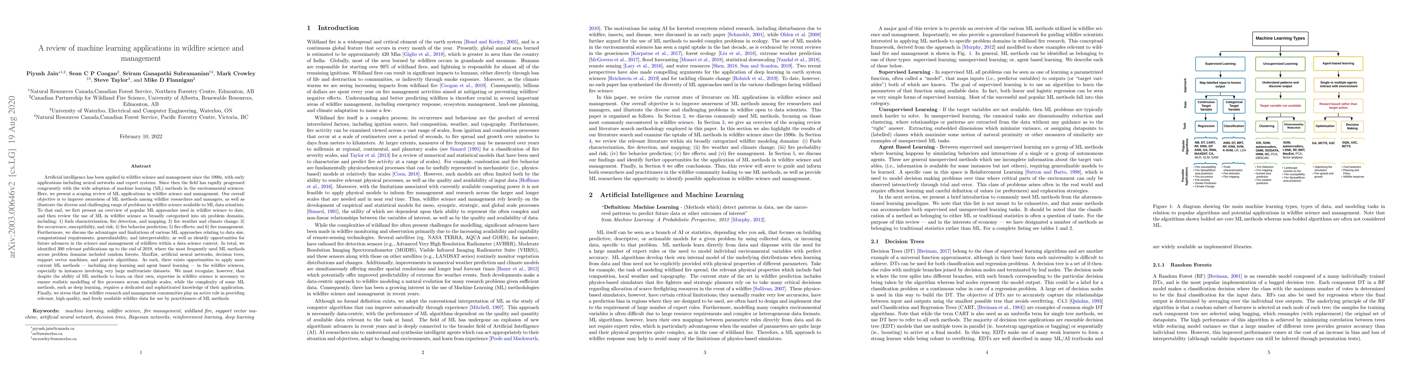 This paper reviews machine learning applications in wildfire science and management, highlighting popular ML methods like random forests and neural networks. It explores their use across six domains, identifies opportunities for future advances, and emphasizes the need for collaboration between data scientists and wildfire experts to ensure realistic modeling.