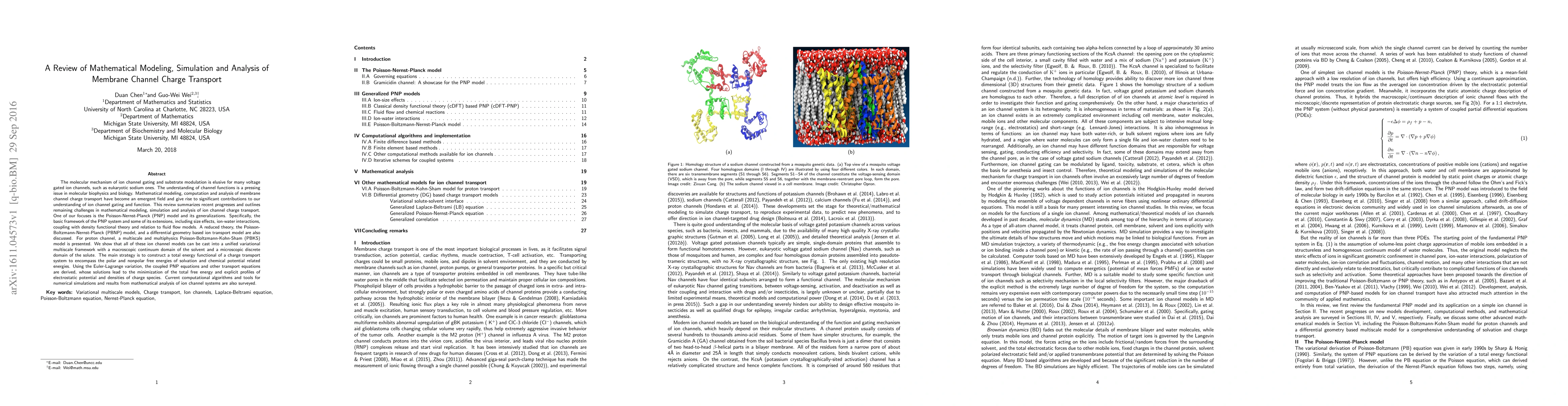 This review explores recent advances in mathematical modeling and simulation of ion channel charge transport, focusing on the Poisson-Nernst-Planck (PNP) model and its extensions. It highlights computational algorithms and analytical results, emphasizing a unified variational multiscale framework for diverse ion channel systems.