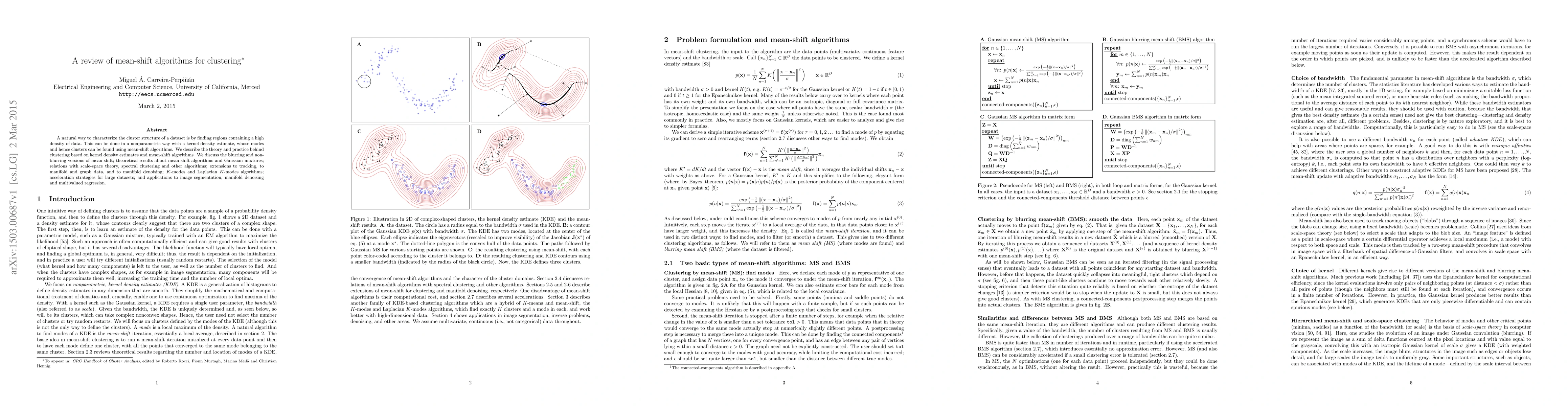 This paper reviews mean-shift algorithms for clustering based on kernel density estimates, discussing various versions, theoretical results, and applications. It also covers extensions to tracking, manifold data, and denoising, along with acceleration strategies for large datasets.