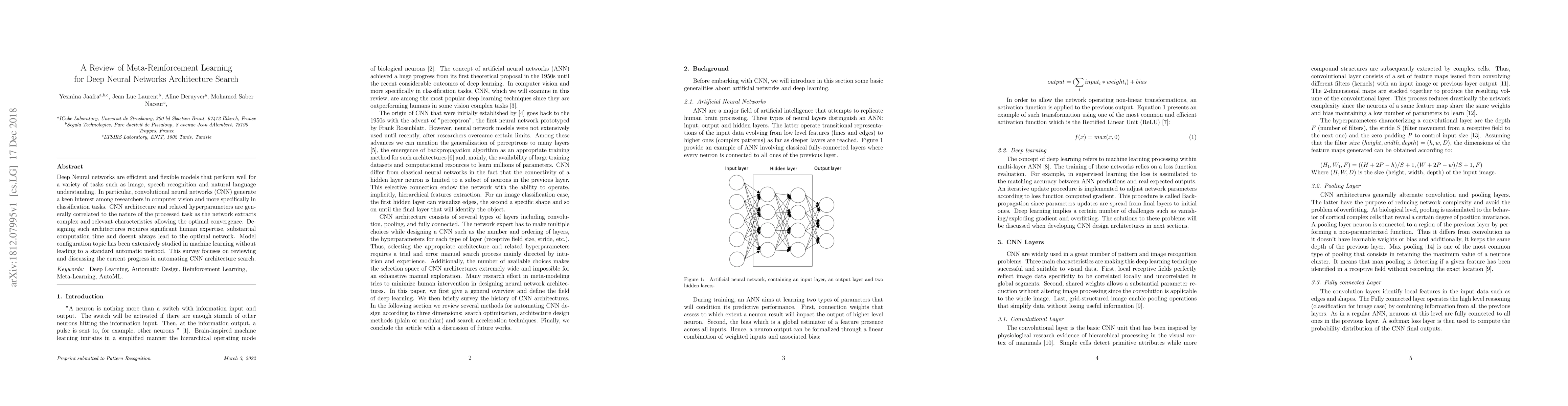 Deep Neural networks are efficient and flexible models that perform well for a variety of tasks such as image, speech recognition and natural language understanding. In particular, convolutional neural networks (CNN) generate a keen interest among researchers in computer vision and more specifically in classification tasks. CNN architecture and related hyperparameters are generally correlated to the nature of the processed task as the network extracts complex and relevant characteristics allowing the optimal convergence. Designing such architectures requires significant human expertise, substantial computation time and doesn't always lead to the optimal network. Model configuration topic has been extensively studied in machine learning without leading to a standard automatic method. This survey focuses on reviewing and discussing the current progress in automating CNN architecture search.