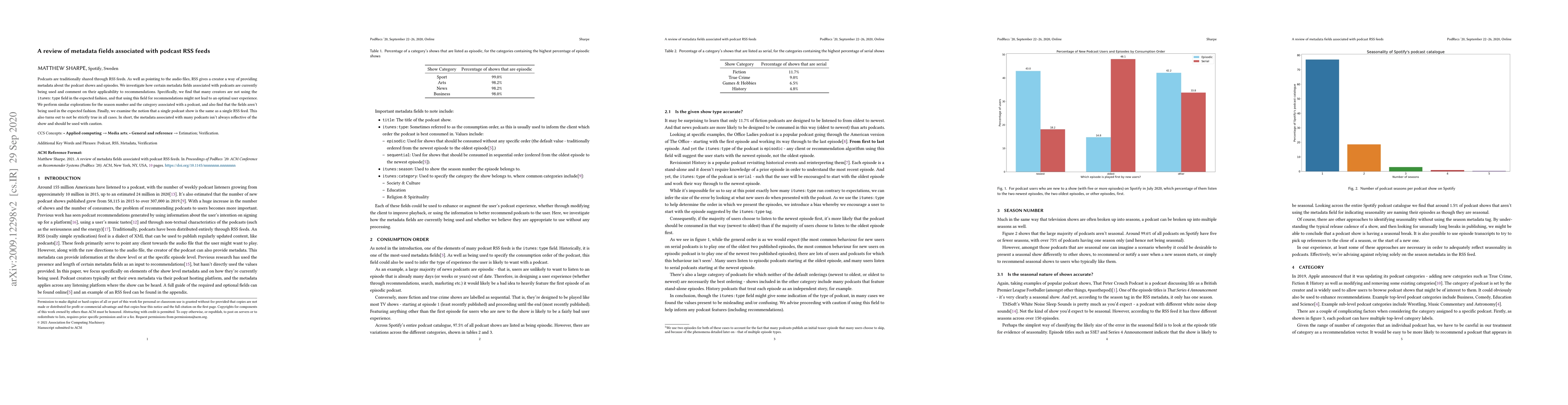 This paper reviews the usage of metadata fields in podcast RSS feeds, finding that many fields like itunes:type, season number, and category are not used as expected, which may hinder effective recommendations and user experience. The study concludes that podcast metadata often does not accurately reflect the show, necessitating cautious use.