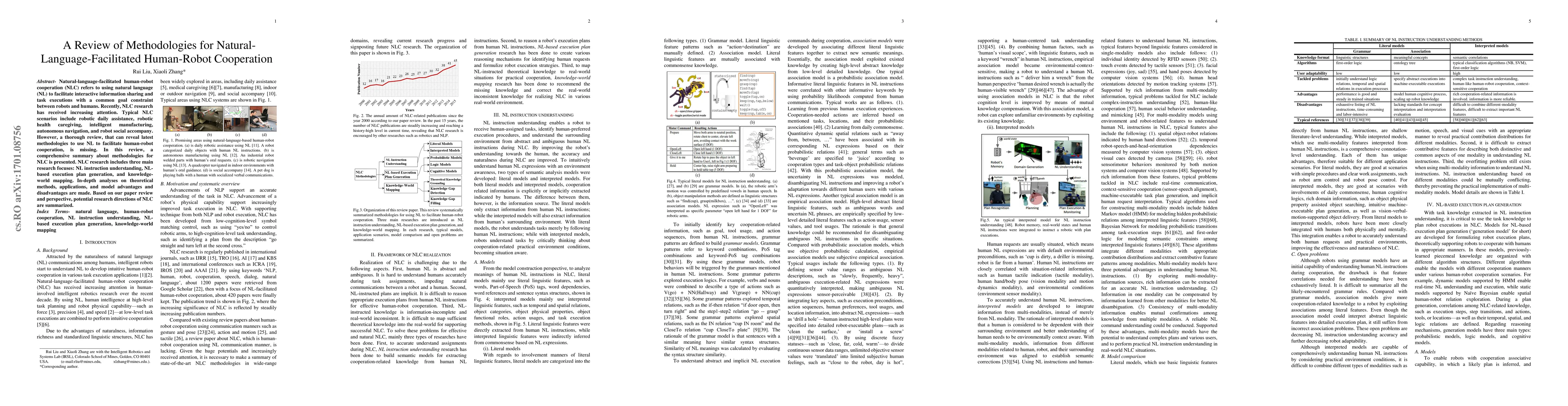 This paper reviews methodologies for natural-language-facilitated human-robot cooperation (NLC), focusing on three main areas: NL instruction understanding, NL-based execution plan generation, and knowledge-world mapping. It provides an in-depth analysis of theoretical methods, applications, and model advantages and disadvantages, and outlines potential future research directions.