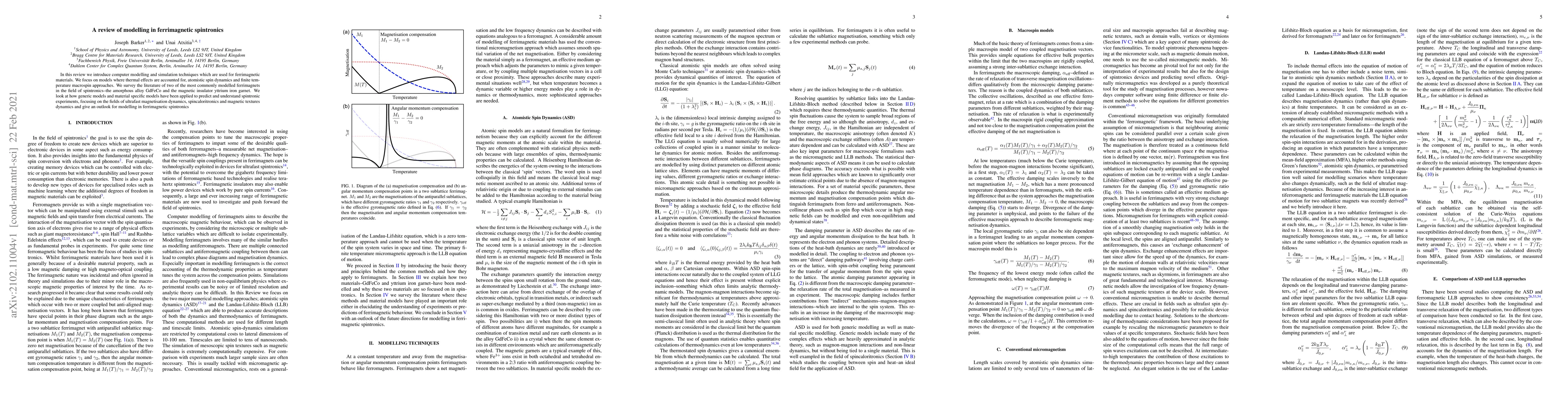 This review paper explores computer modeling techniques for ferrimagnetic materials in spintronics, focusing on two key models: GdFeCo alloy and yttrium iron garnet. It highlights the use of generic and material-specific models to predict and understand spintronic experiments.