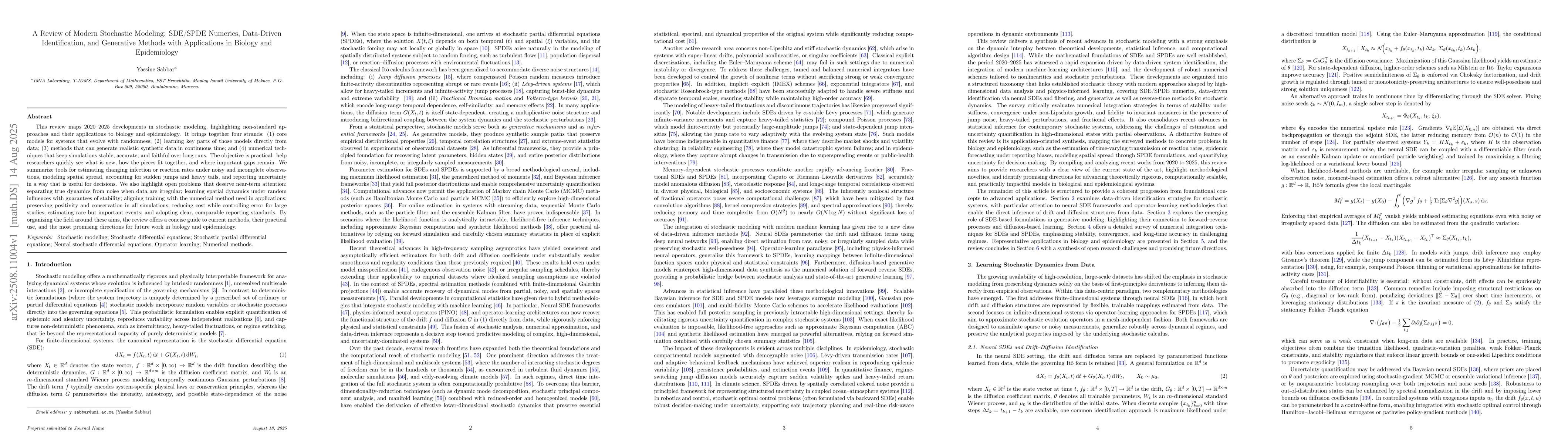 This review maps developments in stochastic modeling, highlighting non-standard approaches and their applications to biology and epidemiology. It brings together four strands: (1) core models for systems that evolve with randomness; (2) learning key parts of those models directly from data; (3) methods that can generate realistic synthetic data in continuous time; and (4) numerical techniques that keep simulations stable, accurate, and faithful over long runs. The objective is practical: help researchers quickly see what is new, how the pieces fit together, and where important gaps remain. We summarize tools for estimating changing infection or reaction rates under noisy and incomplete observations, modeling spatial spread, accounting for sudden jumps and heavy tails, and reporting uncertainty in a way that is useful for decisions. We also highlight open problems that deserve near-term attention: separating true dynamics from noise when data are irregular; learning spatial dynamics under random influences with guarantees of stability; aligning training with the numerical method used in applications; preserving positivity and conservation in all simulations; reducing cost while controlling error for large studies; estimating rare but important events; and adopting clear, comparable reporting standards. By organizing the field around these aims, the review offers a concise guide to current methods, their practical use, and the most promising directions for future work in biology and epidemiology.s.