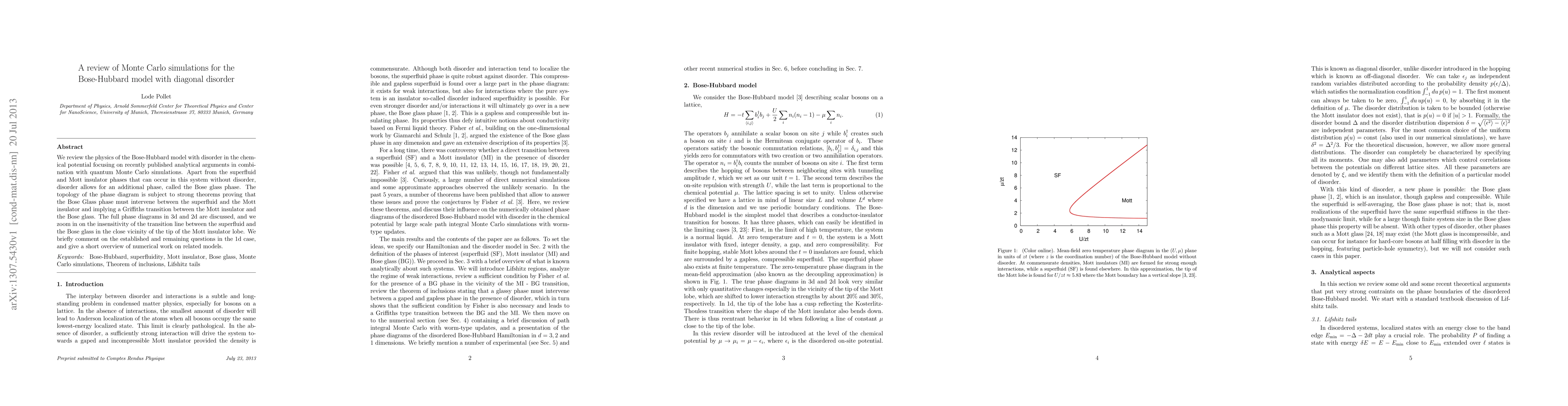This paper reviews Monte Carlo simulations of the Bose-Hubbard model with diagonal disorder, highlighting the emergence of a Bose glass phase between superfluid and Mott insulator phases. It discusses the topology of phase diagrams and the Griffiths transition, focusing on the insensitivity of the transition line near the Mott insulator tip.