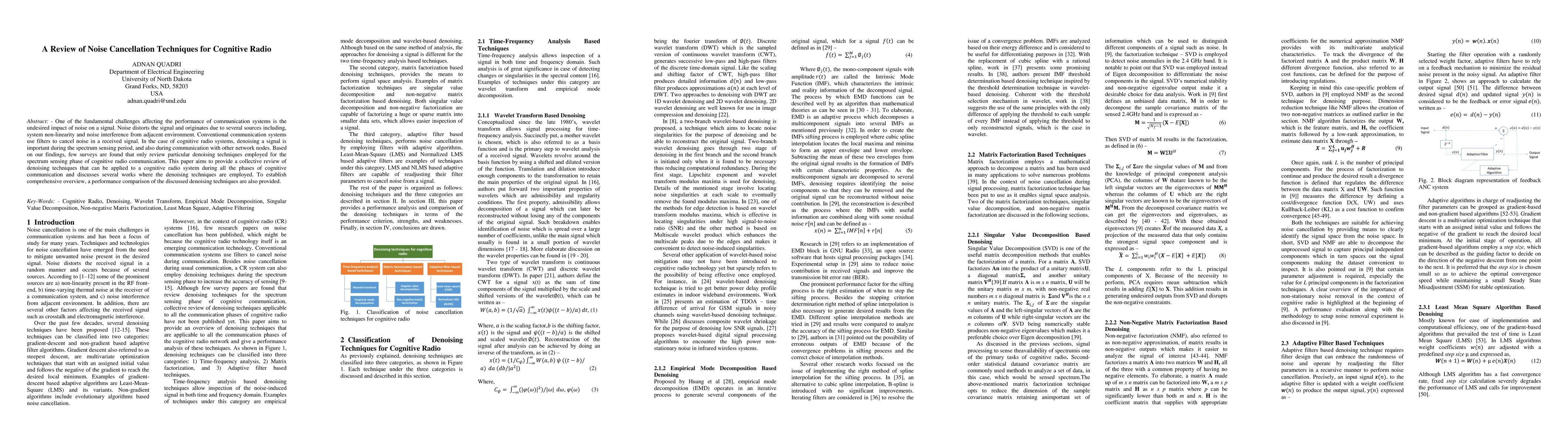 This paper reviews various noise cancellation techniques applicable to cognitive radio systems throughout all communication phases, highlighting their use in spectrum sensing and network interactions. It provides a comparative analysis of these techniques to offer a comprehensive overview.