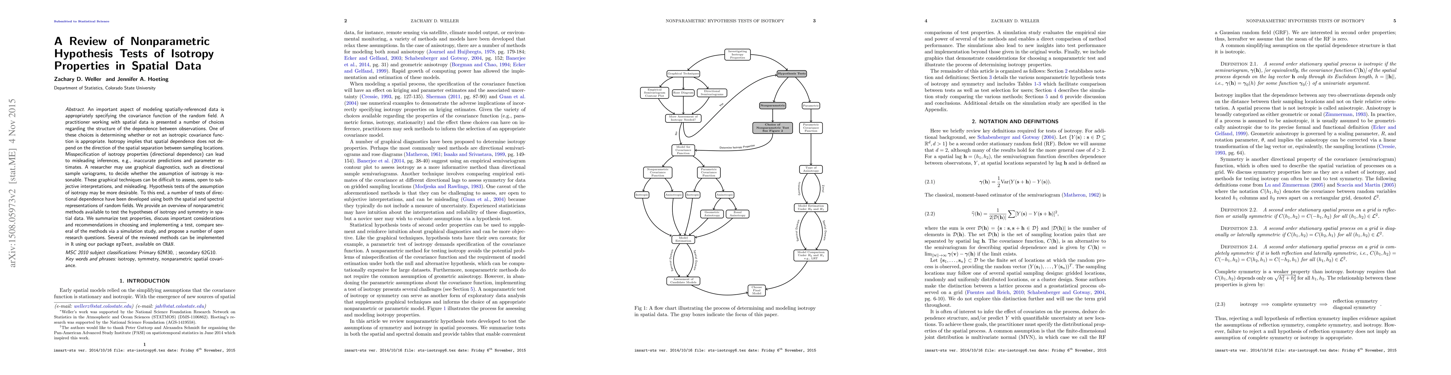 This paper reviews nonparametric hypothesis tests for assessing isotropy in spatial data, comparing various methods and providing recommendations for their use. It also includes a simulation study and proposes open research questions, with several methods implementable in R via the spTest package.