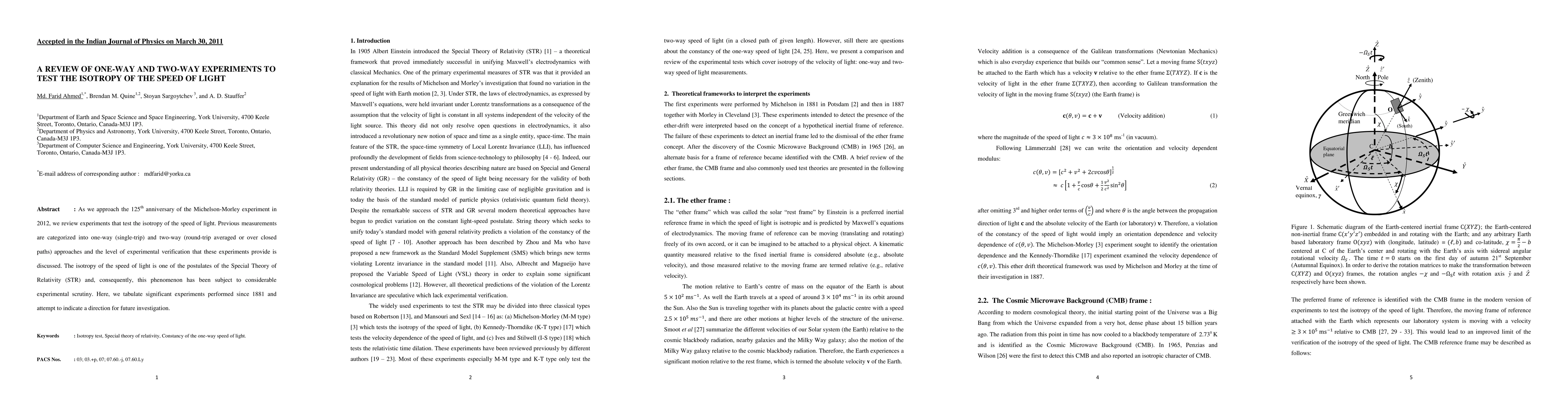 This paper reviews historical and contemporary experiments testing the isotropy of the speed of light, categorizing them into one-way and two-way methods, and discusses their experimental verification levels. It emphasizes the importance of this phenomenon to the Special Theory of Relativity and suggests future research directions.