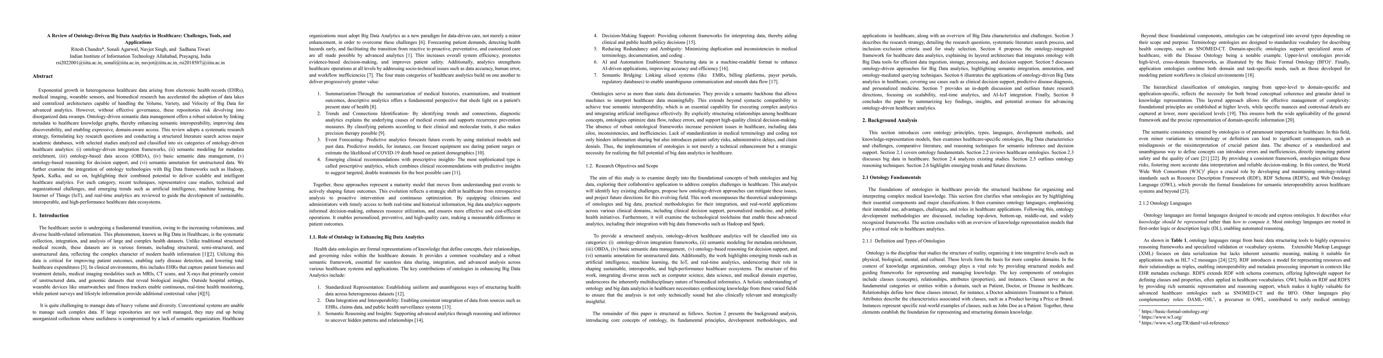 The research employed a systematic literature review approach, formulating key research questions and conducting a structured search across academic databases. Selected studies were classified into six categories of ontology-driven healthcare analytics and analyzed for recent techniques, case studies, challenges, and emerging trends.