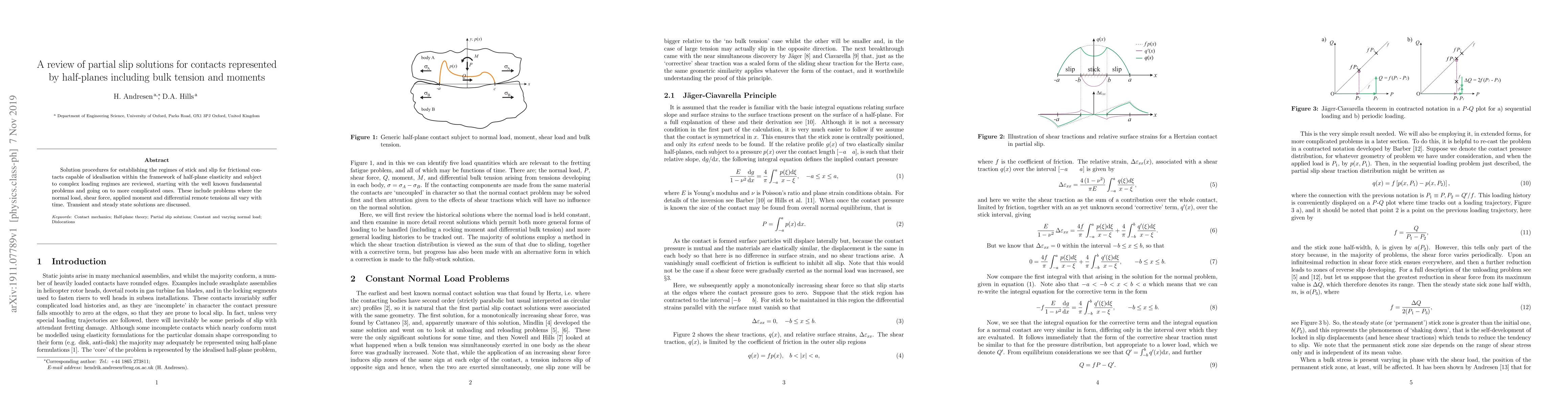 This review paper discusses various partial slip solutions for frictional contacts under complex loading regimes, including bulk tension and moments, focusing on transient and steady state solutions.