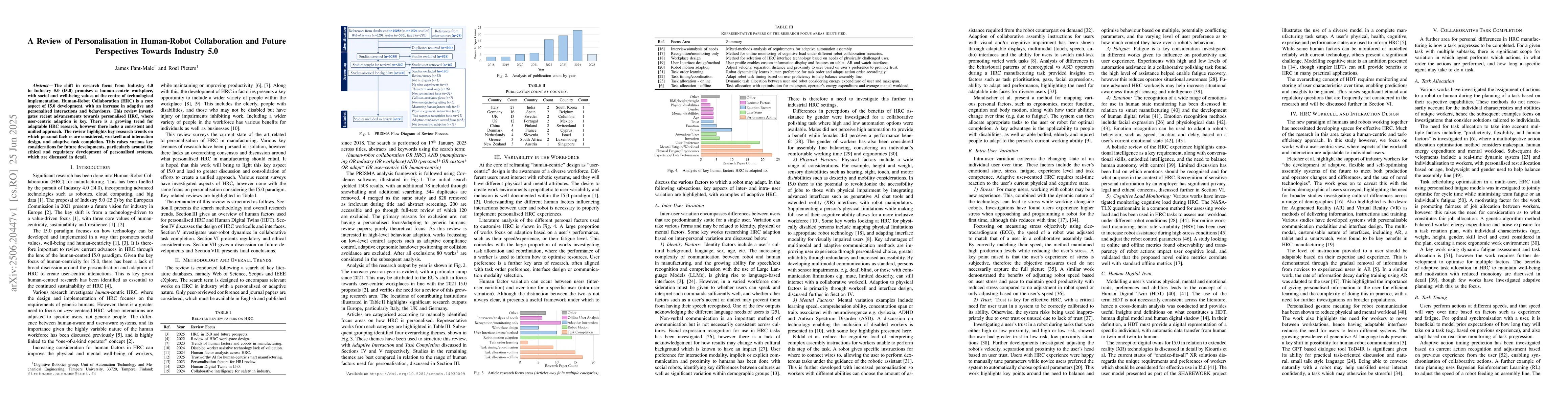 The shift in research focus from Industry 4.0 to Industry 5.0 (I5.0) promises a human-centric workplace, with social and well-being values at the centre of technological implementation. Human-Robot Collaboration (HRC) is a core aspect of I5.0 development, with an increase in adaptive and personalised interactions and behaviours. This review investigates recent advancements towards personalised HRC, where user-centric adaption is key. There is a growing trend for adaptable HRC research, however there lacks a consistent and unified approach. The review highlights key research trends on which personal factors are considered, workcell and interaction design, and adaptive task completion. This raises various key considerations for future developments, particularly around the ethical and regulatory development of personalised systems, which are discussed in detail.