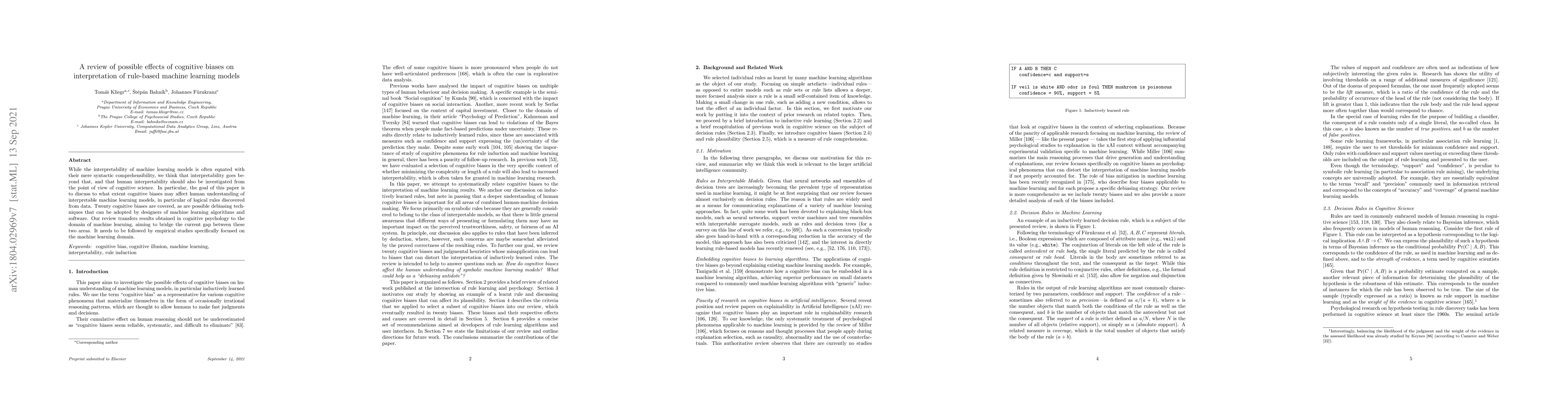 This paper reviews how cognitive biases influence human interpretation of rule-based machine learning models, emphasizing the need for cognitive science insights beyond mere syntactic comprehensibility. It discusses twenty cognitive biases and potential debiasing techniques to improve human understanding of these models.