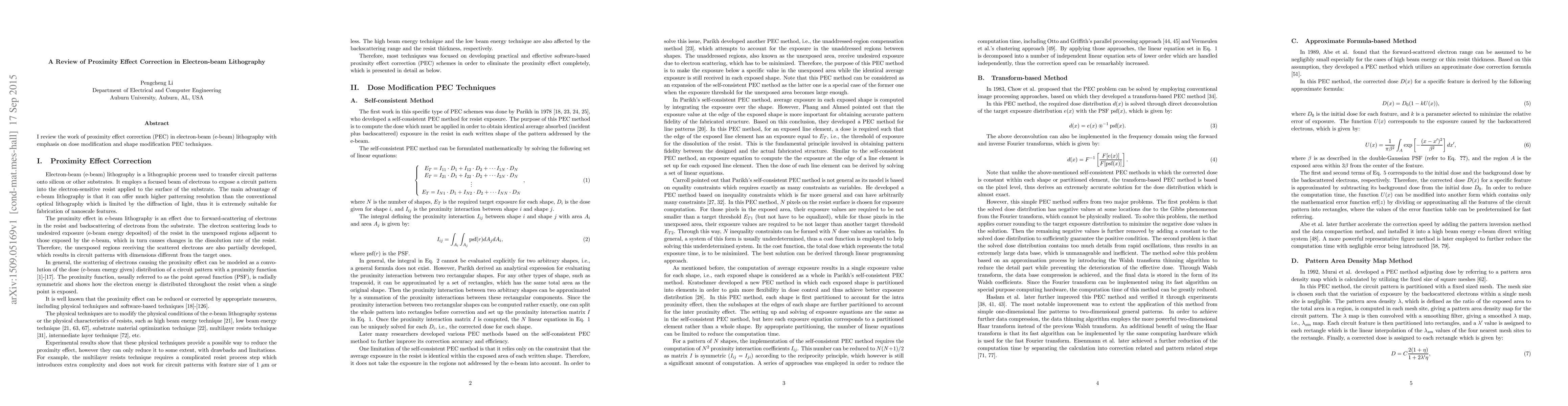 I review the work of proximity effect correction (PEC) in electron-beam (e-beam) lithography with emphasis on dose modification and shape modification PEC techniques.