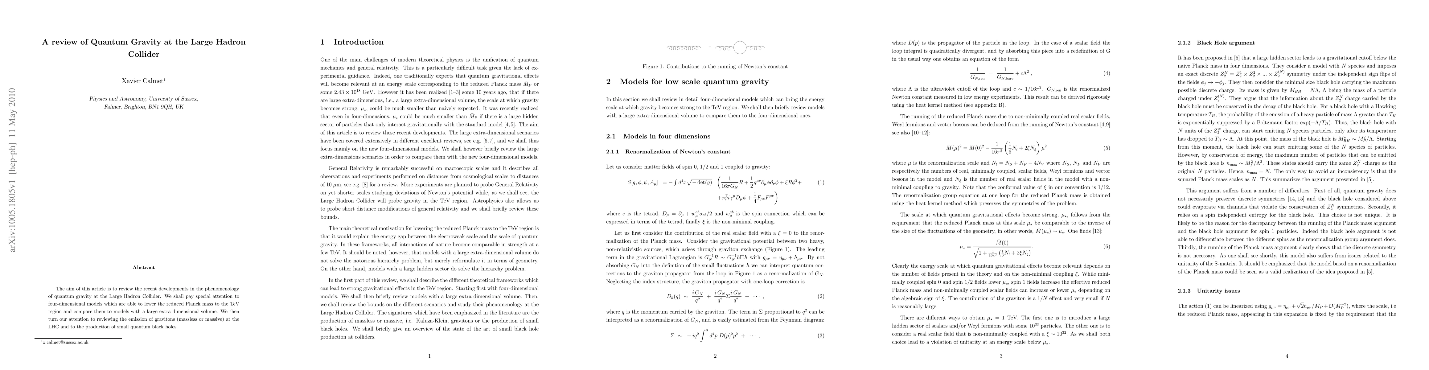 The aim of this article is to review the recent developments in the phenomenology of quantum gravity at the Large Hadron Collider. We shall pay special attention to four-dimensional models which are able to lower the reduced Planck mass to the TeV region and compare them to models with a large extra-dimensional volume. We then turn our attention to reviewing the emission of gravitons (massless or massive) at the LHC and to the production of small quantum black holes.