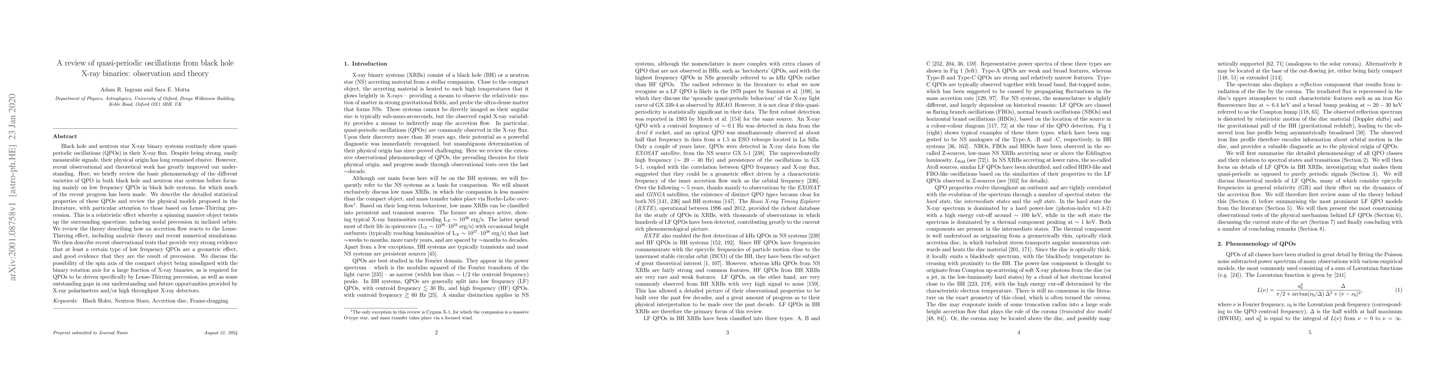 Black hole and neutron star X-ray binary systems routinely show quasi-periodic oscillations (QPOs) in their X-ray flux. Despite being strong, easily measurable signals, their physical origin has long remained elusive. However, recent observational and theoretical work has greatly improved our understanding. Here, we briefly review the basic phenomenology of the different varieties of QPO in both black hole and neutron star systems before focusing mainly on low frequency QPOs in black hole systems, for which much of the recent progress has been made. We describe the detailed statistical properties of these QPOs and review the physical models proposed in the literature, with particular attention to those based on Lense-Thirring precession. This is a relativistic effect whereby a spinning massive object twists up the surrounding spacetime, inducing nodal precession in inclined orbits. We review the theory describing how an accretion flow reacts to the Lense-Thirring effect, including analytic theory and recent numerical simulations. We then describe recent observational tests that provide very strong evidence that at least a certain type of low frequency QPOs are a geometric effect, and good evidence that they are the result of precession. We discuss the possibility of the spin axis of the compact object being misaligned with the binary rotation axis for a large fraction of X-ray binaries, as is required for QPOs to be driven specifically by Lense-Thirring precession, as well as some outstanding gaps in our understanding and future opportunities provided by X-ray polarimeters and/or high throughput X-ray detectors.