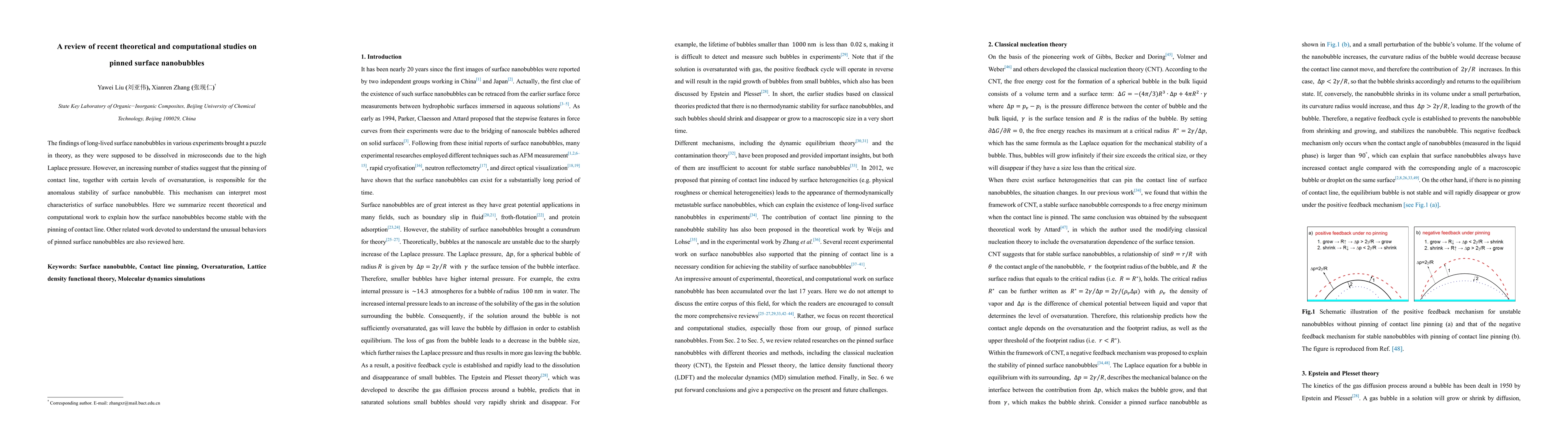 This paper reviews recent theoretical and computational studies explaining the stability of long-lived surface nanobubbles through contact line pinning and oversaturation, addressing the paradox of their persistence against high Laplace pressure. It also covers related work on understanding the unique behaviors of these pinned nanobubbles.