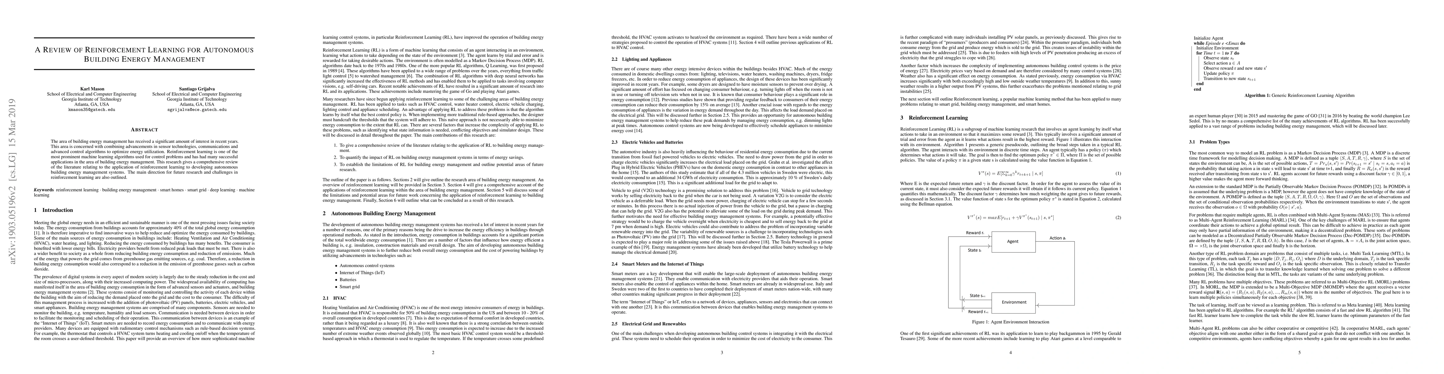 This paper reviews the application of reinforcement learning in optimizing building energy management, highlighting its successful use in control problems and outlining future research directions and challenges. The focus is on leveraging machine learning advancements to enhance autonomous energy systems.
