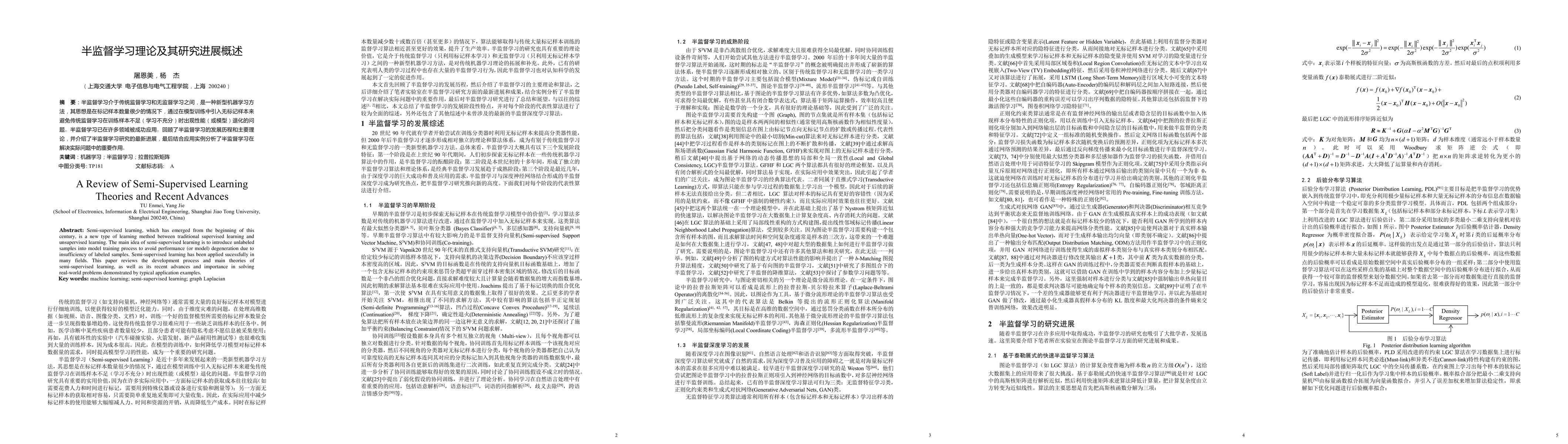 Semi-supervised learning, which has emerged from the beginning of this century, is a new type of learning method between traditional supervised learning and unsupervised learning. The main idea of semi-supervised learning is to introduce unlabeled samples into the model training process to avoid performance (or model) degeneration due to insufficiency of labeled samples. Semi-supervised learning has been applied successfully in many fields. This paper reviews the development process and main theories of semi-supervised learning, as well as its recent advances and importance in solving real-world problems demonstrated by typical application examples.