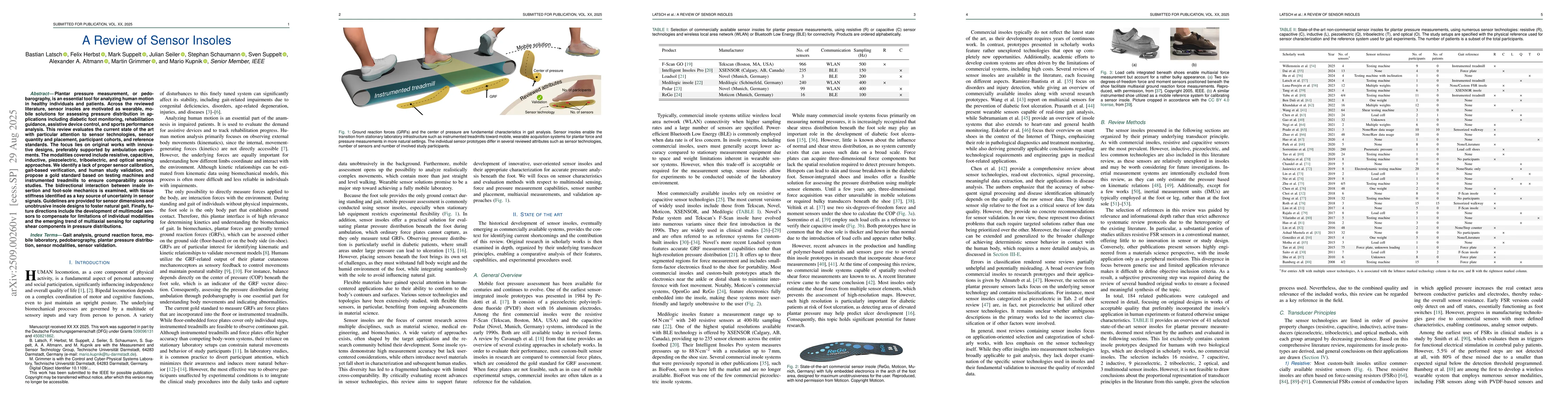 Plantar pressure measurement, or pedobarography, is an essential tool for analyzing human motion in healthy individuals and patients. Across the reviewed literature, sensor insoles are motivated as wearable, mobile solutions for assessing pressure distribution in applications including diabetic foot monitoring, rehabilitation guidance, assistive device control, and sports performance analysis. This review evaluates the current state of the art with particular attention to sensor technologies, sensor quantity and placement, participant cohorts, and reference standards. The focus lies on original works with innovative designs, preferably supported by ambulation experiments. The modalities covered include resistive, capacitive, inductive, piezoelectric, triboelectric, and optical sensing approaches. We identify a lack of proper sensor calibration, gait-based verification, and human study validation, and propose a gold standard based on testing machines and instrumented treadmills to ensure comparability across studies. The bidirectional interaction between insole insertion and foot-sole mechanics is examined, with tissue stiffness identified as a key source of uncertainty in sensor signals. Guidelines are provided for sensor dimensions and unobtrusive insole designs to foster natural gait. Finally, future directions include the development of multimodal sensors to compensate for limitations of individual modalities and the emerging trend of multiaxial sensing for capturing shear components in pressure distributions.
