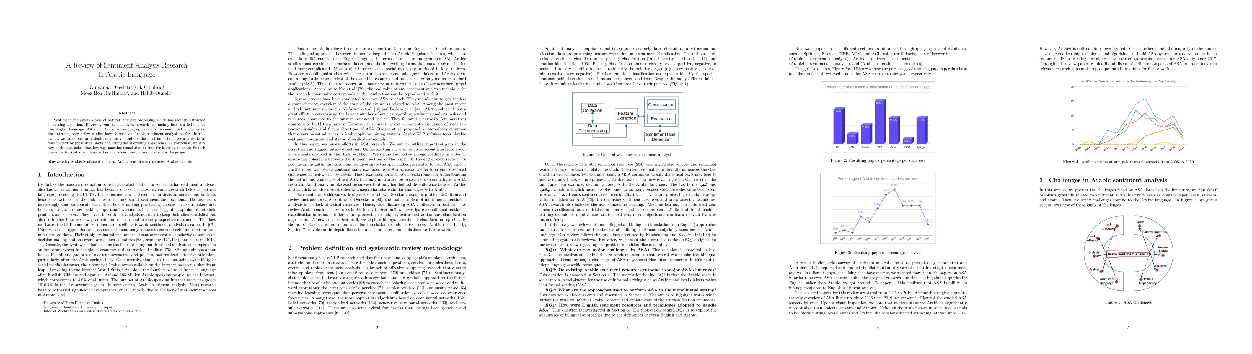 This paper reviews key studies in Arabic sentiment analysis, highlighting both methods that adapt English resources using machine translation or transfer learning and those that develop solutions directly from Arabic language features. The study identifies current limitations and strengths in existing approaches.
