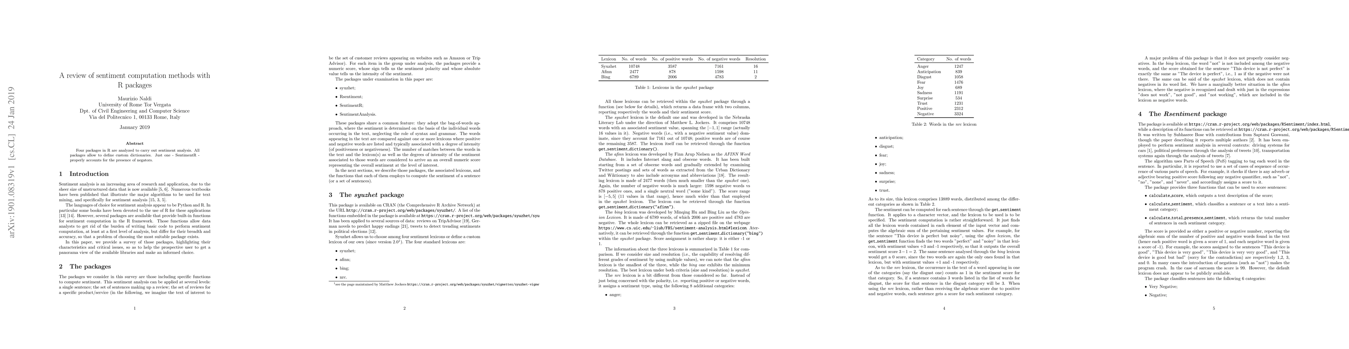 Summary: This review evaluates four R packages for sentiment analysis, highlighting that while all allow custom dictionary definitions, only the Sentiment R package accurately considers the impact of negators in sentiment computation.
