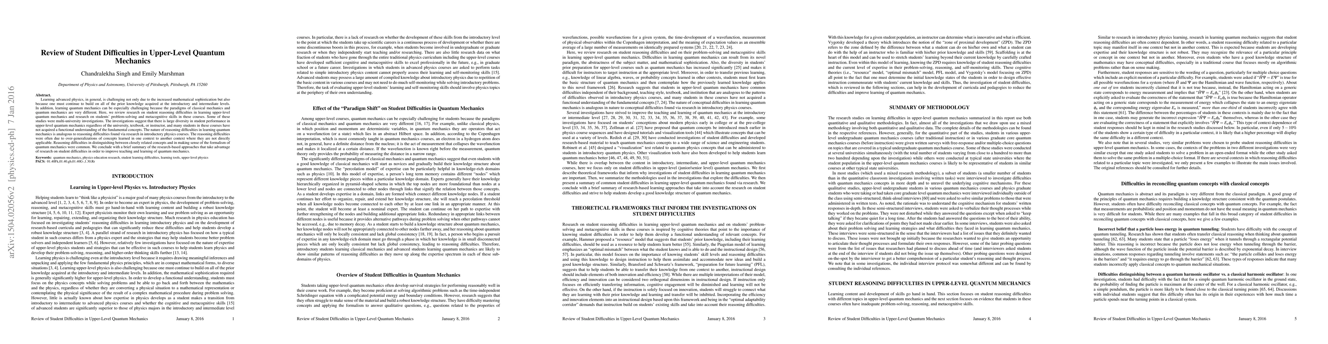 This paper reviews student difficulties in upper-level quantum mechanics, highlighting challenges in reasoning, problem-solving, and metacognitive skills. It finds that many students struggle with over-generalizing concepts and distinguishing between closely related concepts, leading to a lack of functional understanding.