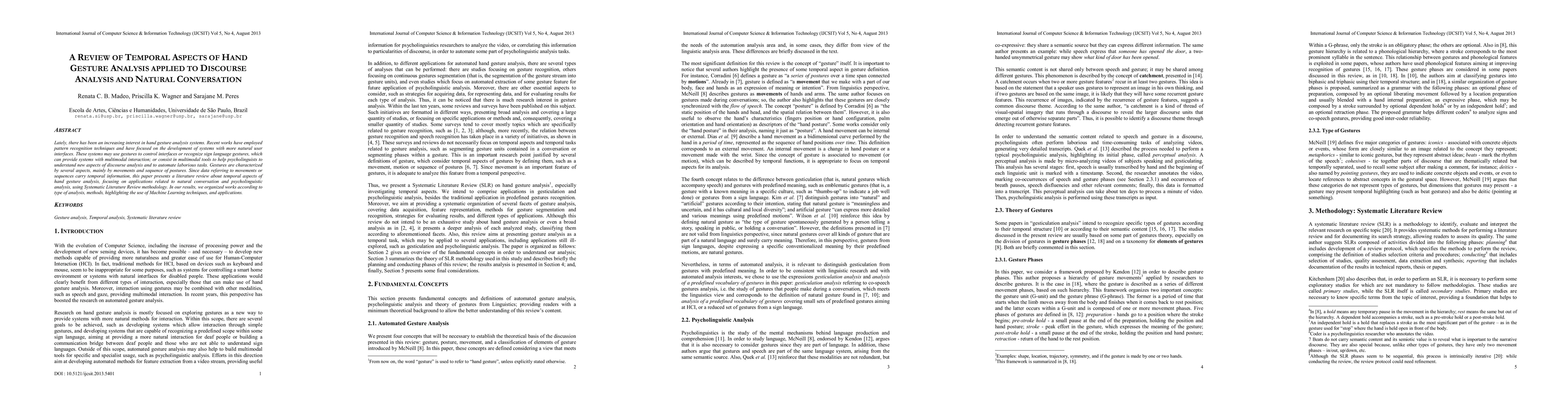 This paper reviews temporal aspects of hand gesture analysis, emphasizing its applications in natural conversation and psycholinguistic analysis. It highlights the use of machine learning techniques and systematically categorizes research based on analysis methods and applications.