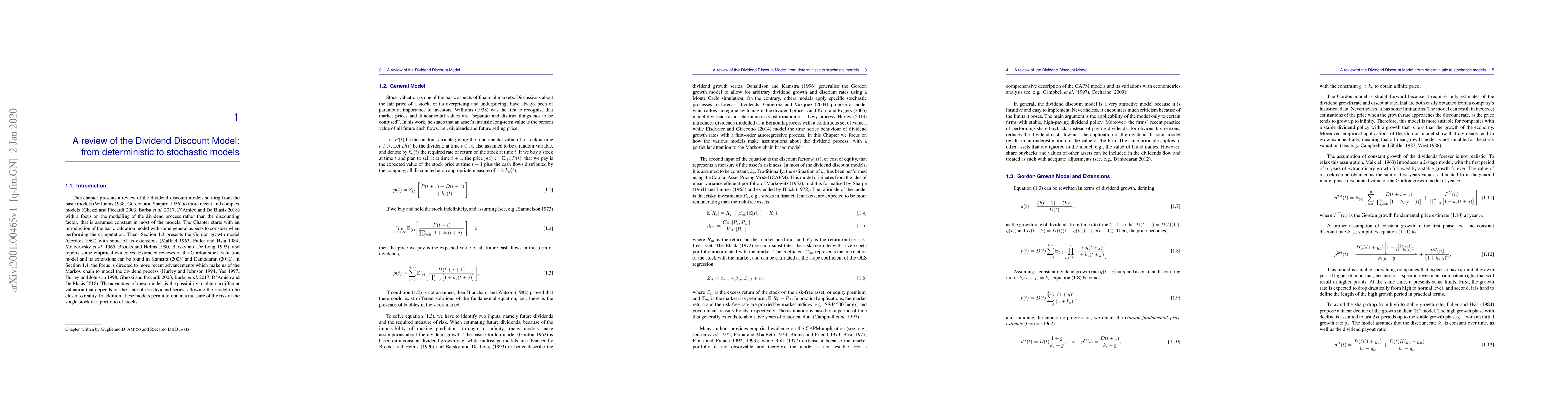 This chapter presents a review of the dividend discount models starting from the basic models (Williams 1938, Gordon and Shapiro 1956) to more recent and complex models (Ghezzi and Piccardi 2003, Barbu et al. 2017, D'Amico and De Blasis 2018) with a focus on the modelling of the dividend process rather than the discounting factor, that is assumed constant in most of the models. The Chapter starts with an introduction of the basic valuation model with some general aspects to consider when performing the computation. Then, Section 1.3 presents the Gordon growth model (Gordon 1962) with some of its extensions (Malkiel 1963, Fuller and Hsia 1984, Molodovsky et al. 1965, Brooks and Helms 1990, Barsky and De Long 1993), and reports some empirical evidence. Extended reviews of the Gordon stock valuation model and its extensions can be found in Kamstra (2003) and Damodaran (2012). In Section 1.4, the focus is directed to more recent advancements which make us of the Markov chain to model the dividend process (Hurley and Johnson 1994, Yao 1997, Hurley and Johnson 1998, Ghezzi and Piccardi 2003, Barbu et al. 2017, D'Amico and De Blasis 2018). The advantage of these models is the possibility to obtain a different valuation that depends on the state of the dividend series, allowing the model to be closer to reality. In addition, these models permit to obtain a measure of the risk of the single stock or a portfolio of stocks.