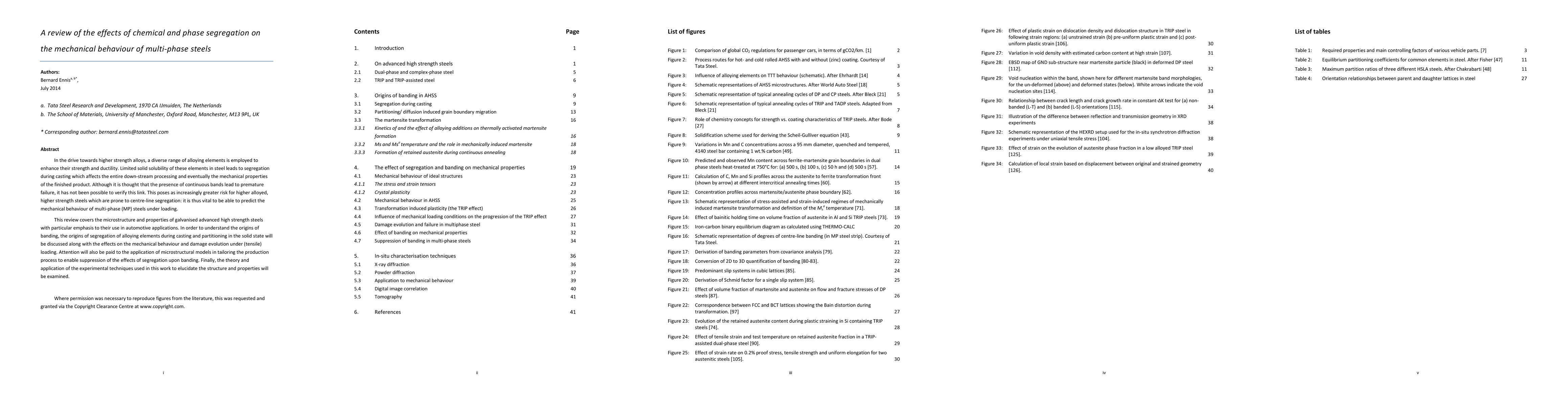 In the drive towards higher strength alloys, a diverse range of alloying elements is employed to enhance their strength and ductility. Limited solid solubility of these elements in steel leads to segregation during casting which affects the entire down-stream processing and eventually the mechanical properties of the finished product. Although it is thought that the presence of continuous bands lead to premature failure, it has not been possible to verify this link. This poses as increasingly greater risk for higher alloyed, higher strength steels which are prone to centre-line segregation: it is thus vital to be able to predict the mechanical behaviour of multi-phase (MP) steels under loading. This review covers the microstructure and properties of galvanised advanced high strength steels with particular emphasis to their use in automotive applications. In order to understand the origins of banding, the origins of segregation of alloying elements during casting and partitioning in the solid state will be discussed along with the effects on the mechanical behaviour and damage evolution under (tensile) loading. Attention will also be paid to the application of microstructural models in tailoring the production process to enable suppression of the effects of segregation upon banding. Finally, the theory and application of the experimental techniques used in this work to elucidate the structure and properties will be examined.