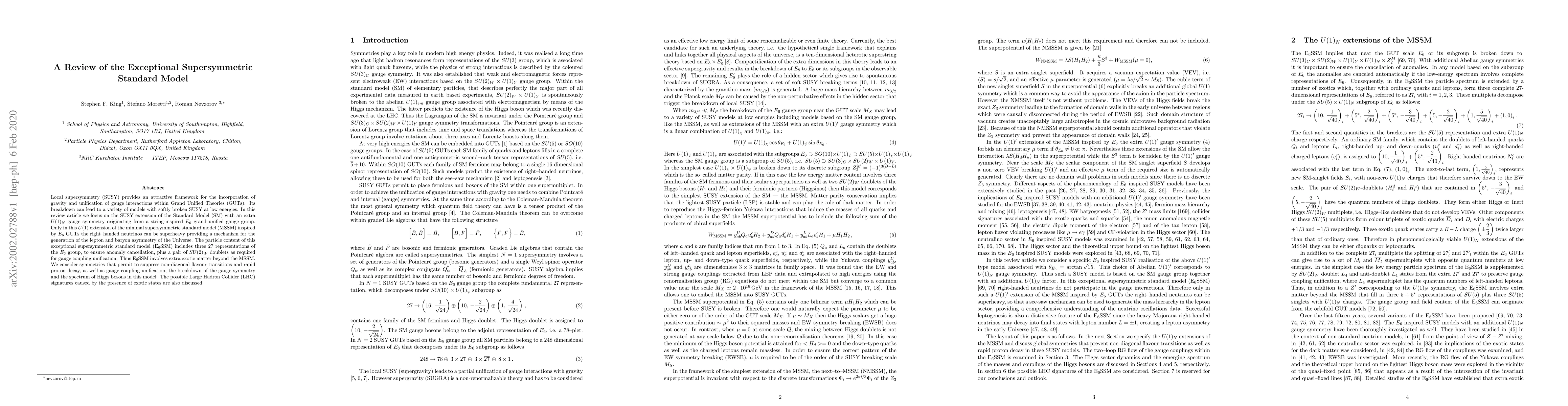 This review explores the exceptional supersymmetric standard model (E_6SSM) that extends the minimal supersymmetric standard model (MSSM) with an extra U(1)_{N} gauge symmetry from a string-inspired E_6 grand unified gauge group, providing a mechanism for generating lepton and baryon asymmetry and discussing its LHC signatures. The model includes exotic matter beyond the MSSM and focuses on symmetries, gauge coupling unification, and Higgs spectrum.