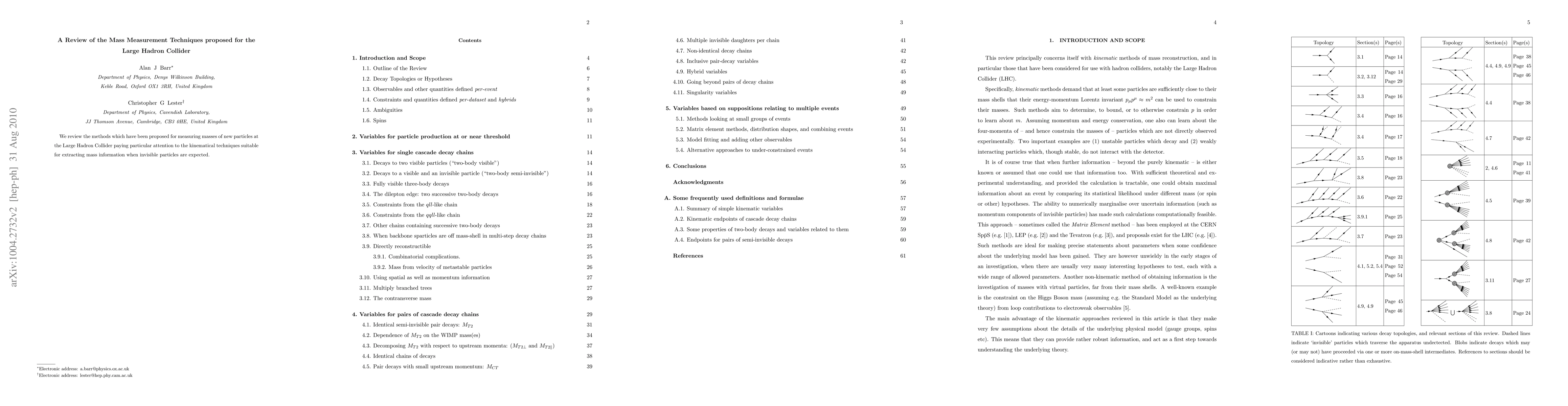 Summary: This paper reviews mass measurement techniques for new particles at the Large Hadron Collider, focusing on kinematical methods for extracting mass information when particles have invisible decay products. Emphasis is placed on innovative approaches to handle such complex scenarios.