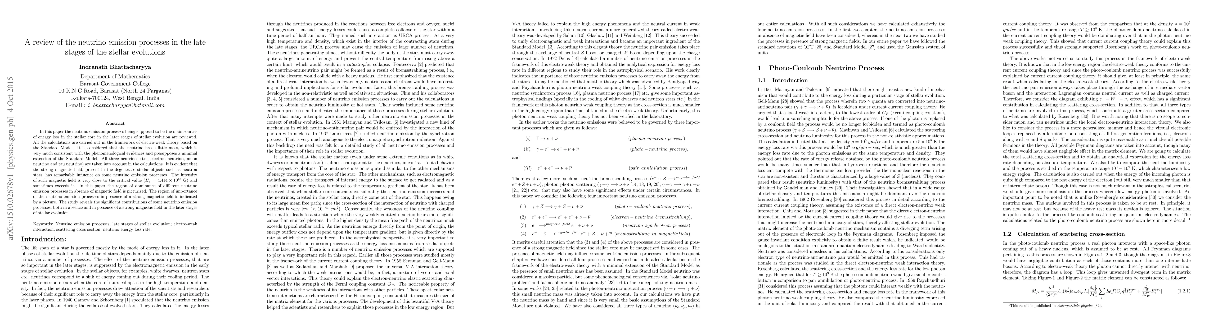 This paper reviews neutrino emission processes in late stellar evolution stages, emphasizing their role in energy loss within stellar cores. It utilizes the electro-weak theory of the Standard Model, considering neutrinos' small mass and the influence of strong magnetic fields in neutron stars, highlighting the dominance of various processes under different magnetic conditions.