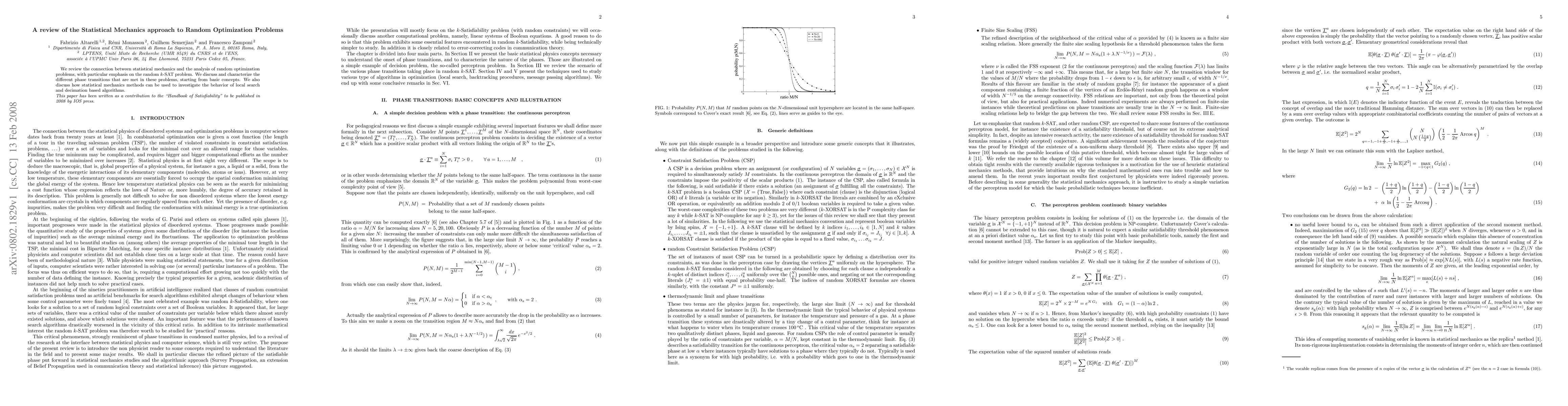 This paper reviews the application of statistical mechanics to random optimization problems, focusing on the random k-SAT problem. It characterizes phase transitions and explores how statistical mechanics methods enhance the understanding of local search and decimation-based algorithms.